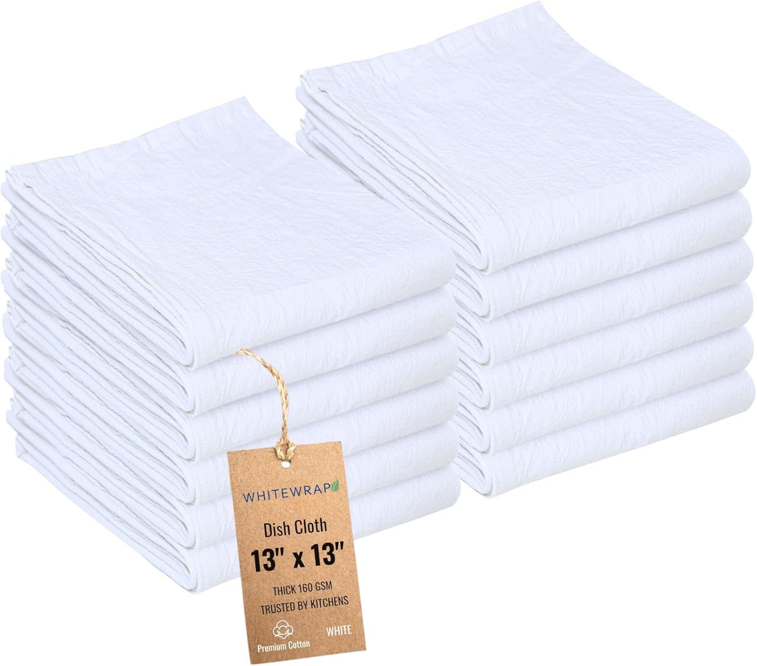 Dish Cloths Cotton| Kitchen Wash Cloth| Shop Towels Absorbent and Lint Free Flour Sack| Dishcloths for Kitchen Washing Dishes|Thick Absorbent Quick Dry Dish Rags | 12 Pack 13"x13" White