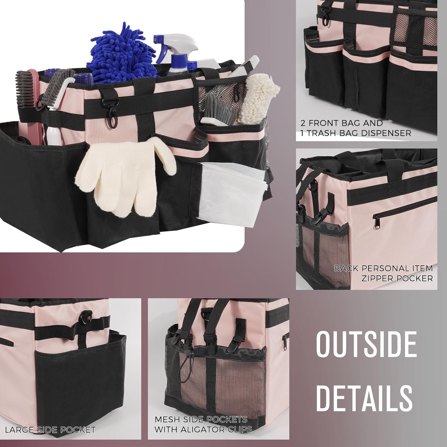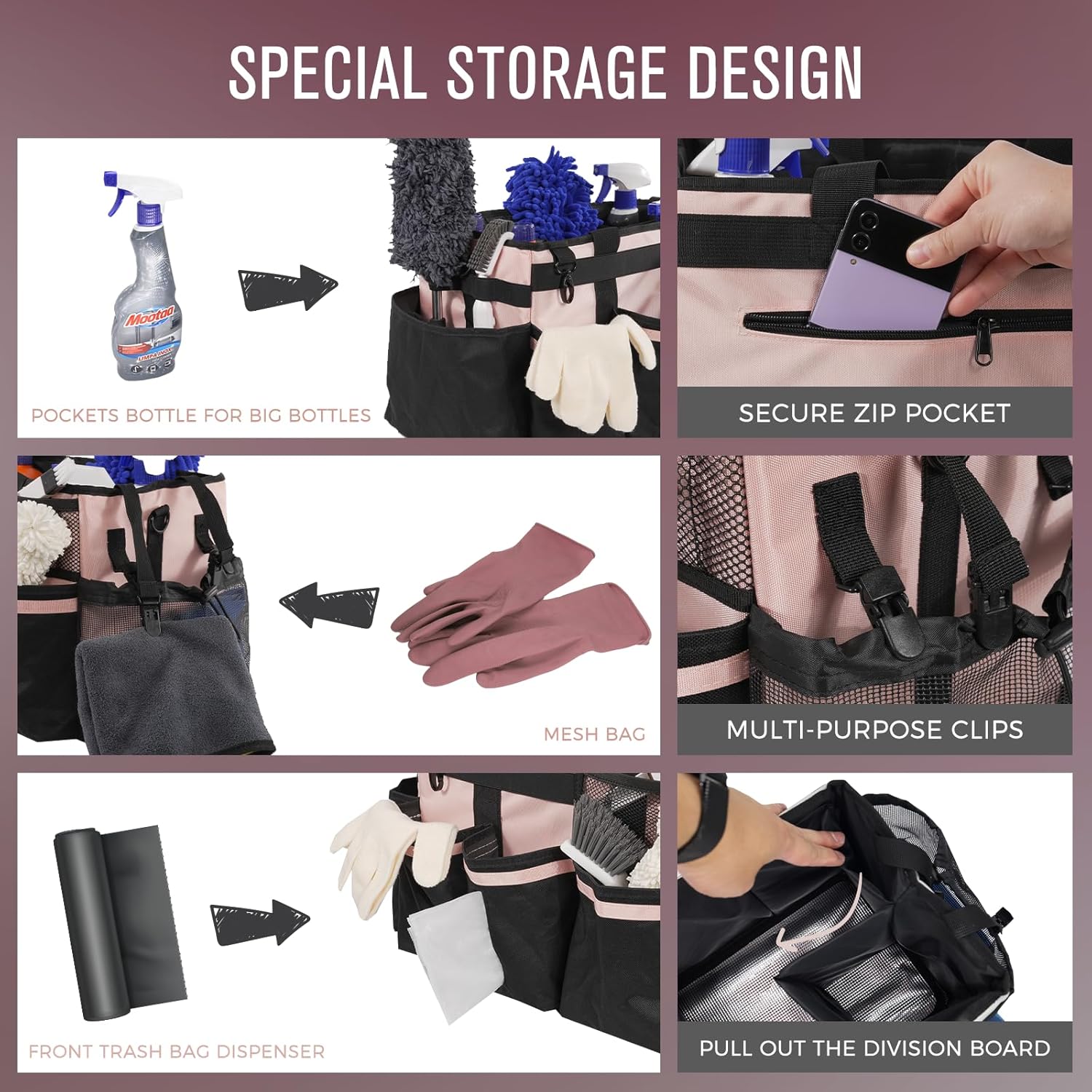 - Exquisite Details: The 5 inner compartments are large enough for organizing cleaning tools. 3 individual deep outer pockets, 1 mesh side pocket and 1 trash bag dispenser allow you storage and access of other cleaning tools. Also, securely zipped pocket is design for safely storing your important items