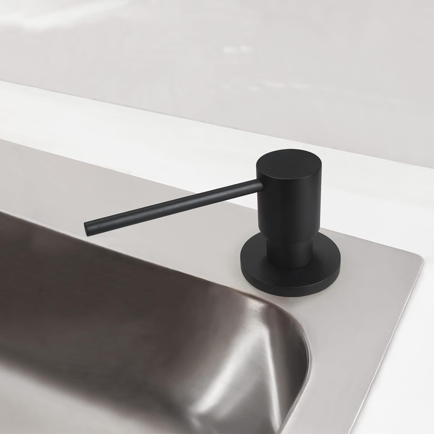 - Built To Last:Sturdy built in sink soap dispenser for kitchen sink,pump head, pump core and threaded tube are made with solid brass, equiped with corrosion resistant spring. It comes with a 17 OZ large plastic bottle. SOLID BRASS CONSTRUCTION Matte black rust resistant finish that will not tarnish as time goes on. The heavy soap dispenser pump mechanism is designed for long lasting excellent performance to dispense consistently with each and every press. Matching perfectly with most faucet models from different brands.