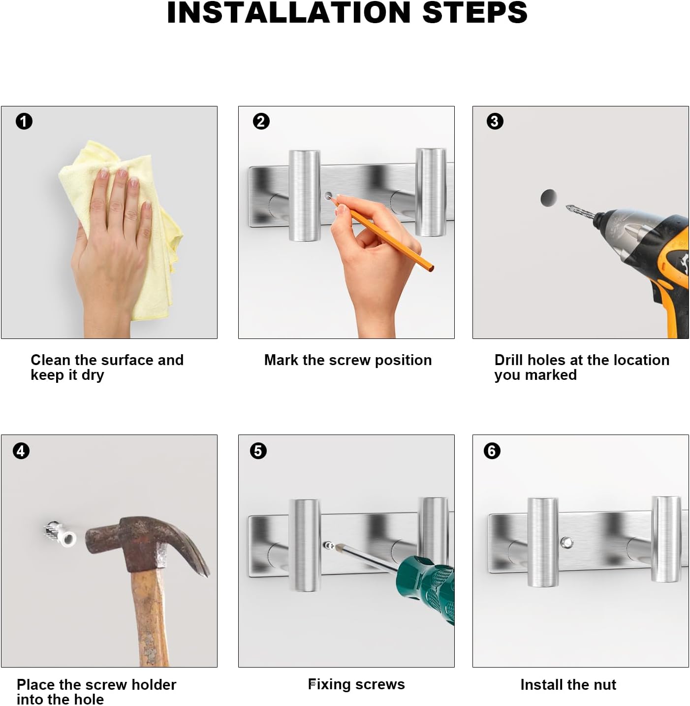 - VERSATILE USE:This Silvery Row Hook Coat Rack with 4 Hooks is good for various locations, including bathrooms, kitchens, living rooms, entrances, and offices. Use it to hang towels, kitchenware, coats, hats, jackets, wallets, keys, and more, adding functionality and organization to your space