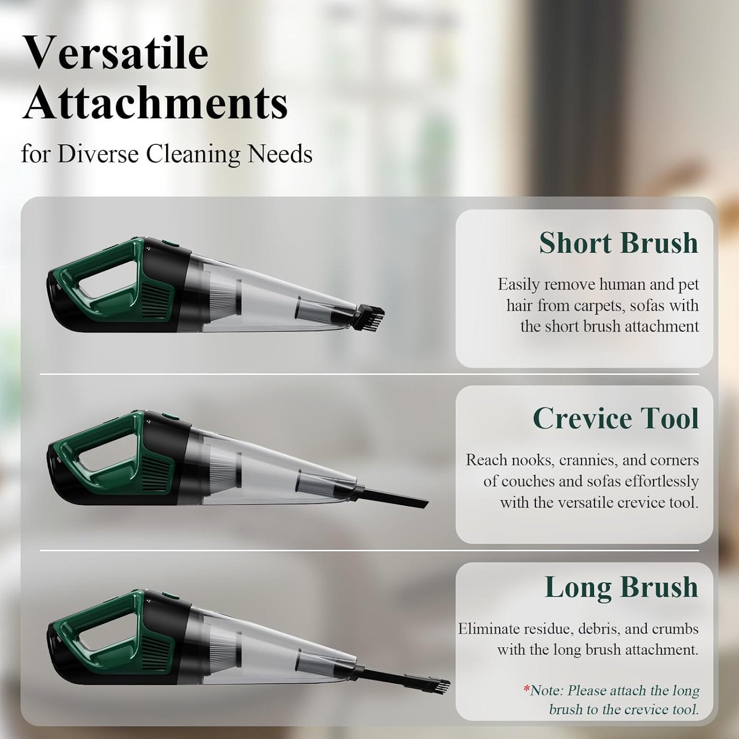 - ăAccessories for Every Cleaning ChallengeăFrom carpets to crevices, the cordless handheld vacuum cleaner is equipped with three versatile accessories to handle any cleaning scenario. The long brush tackles embedded dirt, the short brush swiftly removes dust and pet hair from sofa, carpet, or fabric surfaces, while the crevice tool reaches those tight corners and narrow gaps with ease. Versatility has never been easier.