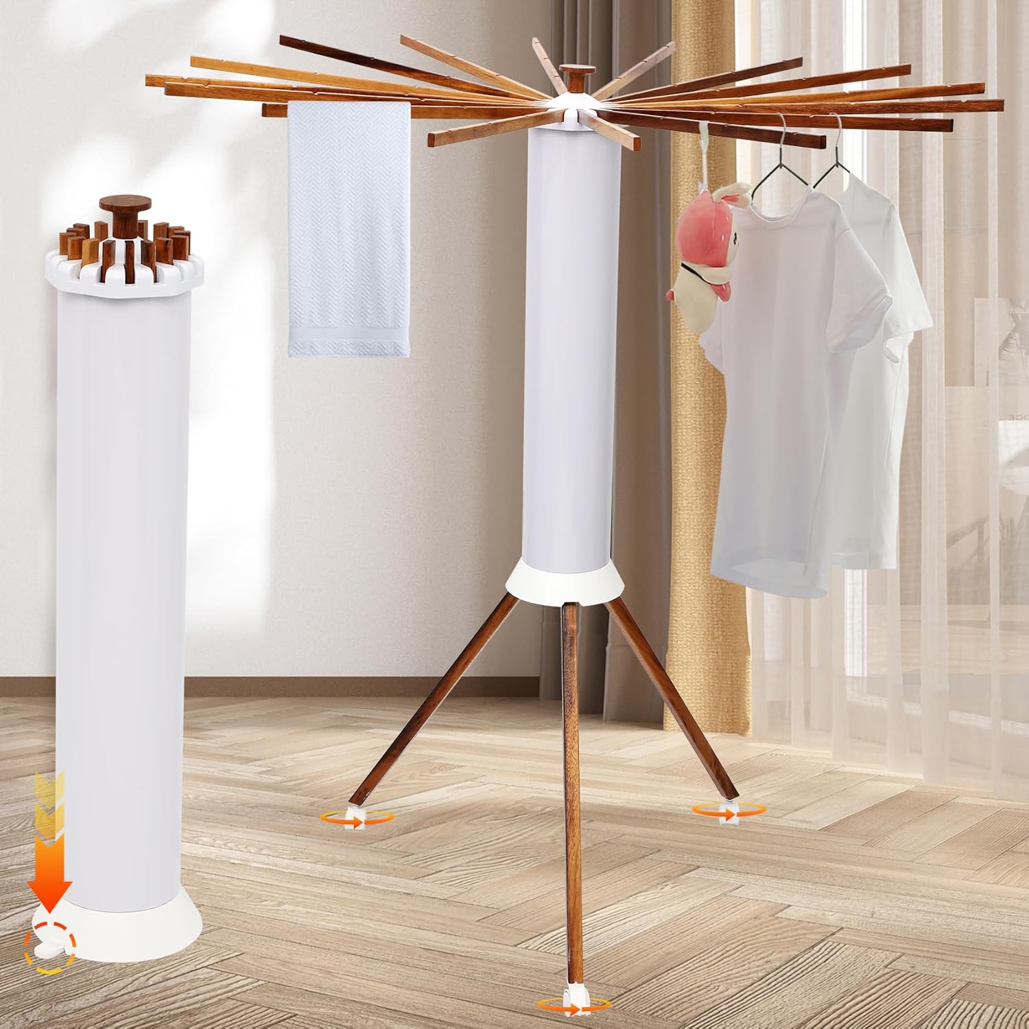 - Space-Saving & Tool-Free Assembly Quick fold/unfold design saves 90% storage space – ideal for small apartments or homes without dryers Patented tripod structure ensures stability in tight spaces (holds up to 45 lbs / 20 kg) Expandable arms (16 rods included + 2 spare rods) adapt to different drying needs