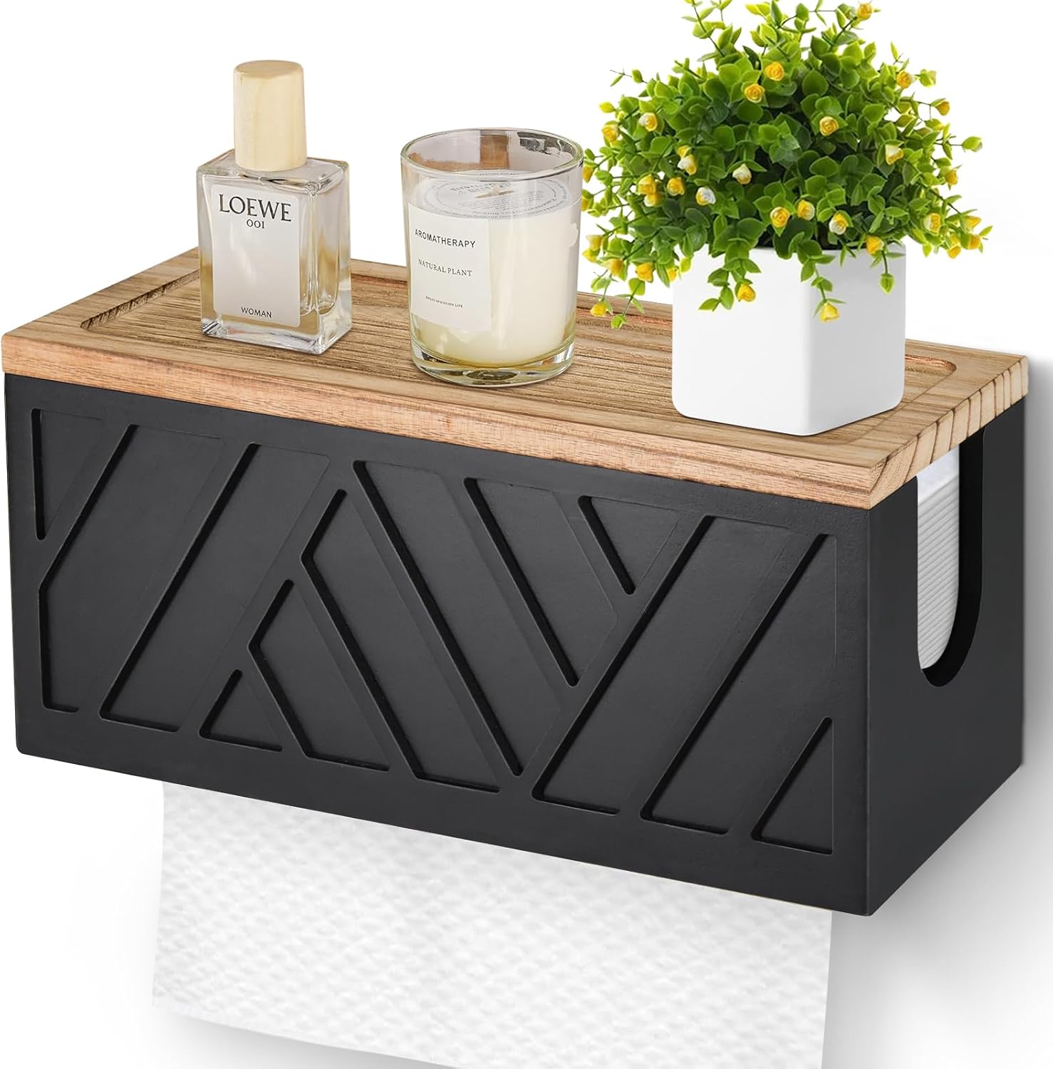 - 【Practical Paper Towel Holder for Farmhouse Decor】Our bathroom napkin dispenser is practical and beautiful. With wide and smooth opening bottom, our wall mount paper towel holder helps you easily access to the towel paper you need. In addition, the brown lid, exquisite carving, and black appearance of the bathroom paper towel holder adds a rustic home decor to the room.Whether on display on your countertop, or hang on your home wall, the bathroom paper towel holder is an eye-catching focus