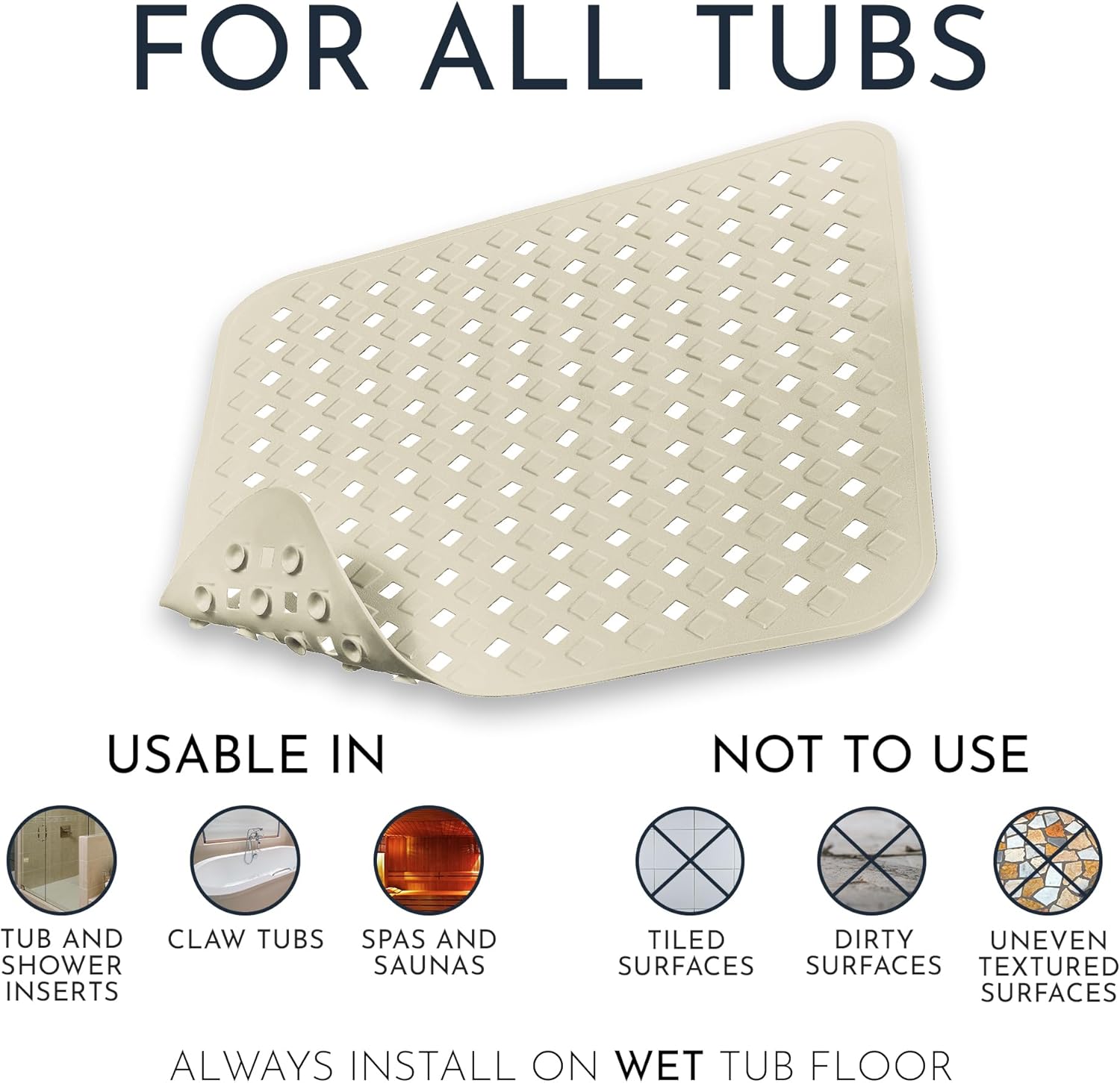 - Mold & Mildew? NOT A CHANCE! Our shower non slip is machine washable on cold wash. The shower anti slip mat has extra large holes so the water can circulate & drain optimally - no matter where the drain is.