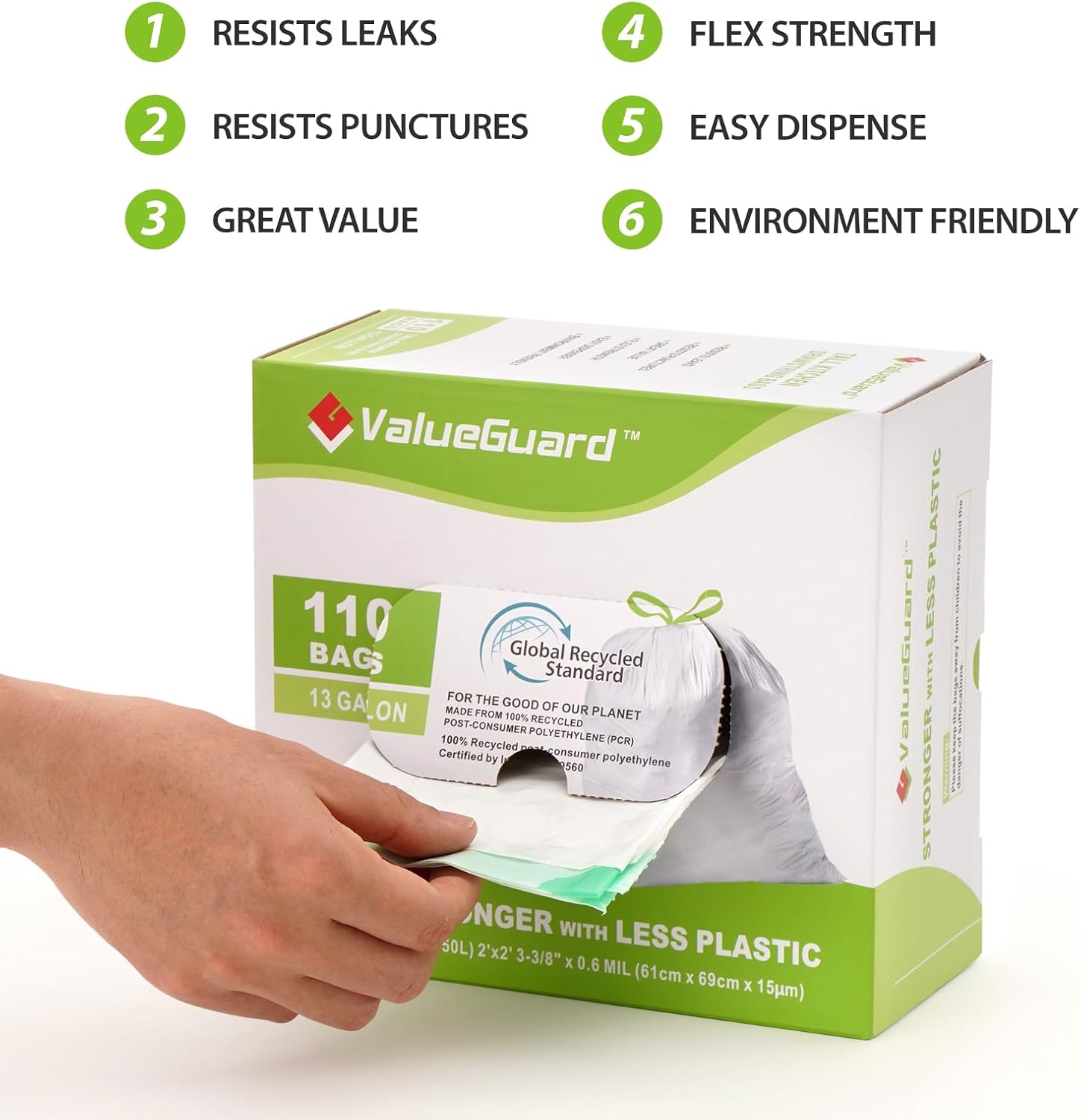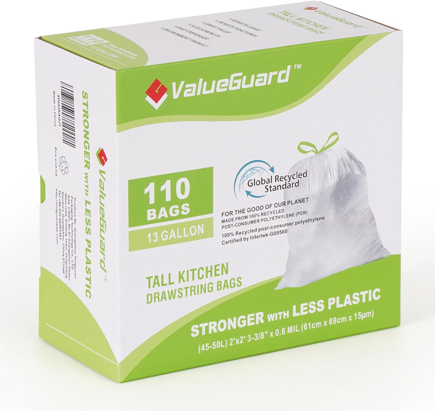 - MADE WITH RECYCLED PLASTIC: For the good of our planet, ValueGuard trash bag made of high quality eco-friendly PCR, which 100% recycled post-consumer polyethylene Certified by Intertek-G09560, accord with global recycled standard.