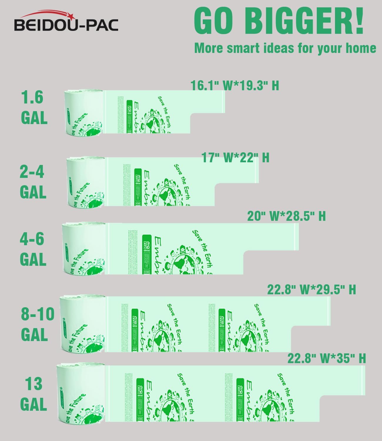 - [KITCHEN COMPOST BIN COMPATIBLE] -- BEIDOU-PAC Compostable Bags, 8-10 gallon 22.8" X 29.5" x 0.75 mils, 60 Count (Pack of 2), home compostable and biodegradable are compatible with a backyard compost system. Our compost trash bags can perfect for 8, 9, 10 gallon under-the-sink kitchen trash can.