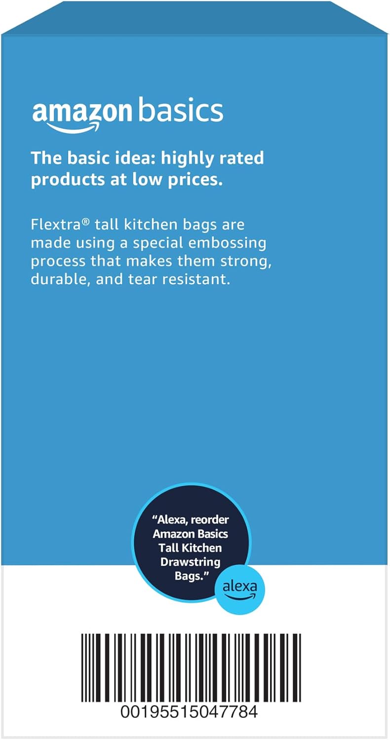 Amazon Basics 13 Gallon Flextra Strength Tall Kitchen Drawstring Trash Bags, Tear Resistant, Clean Fresh Scent, 10% Recycled Content, 50 Count