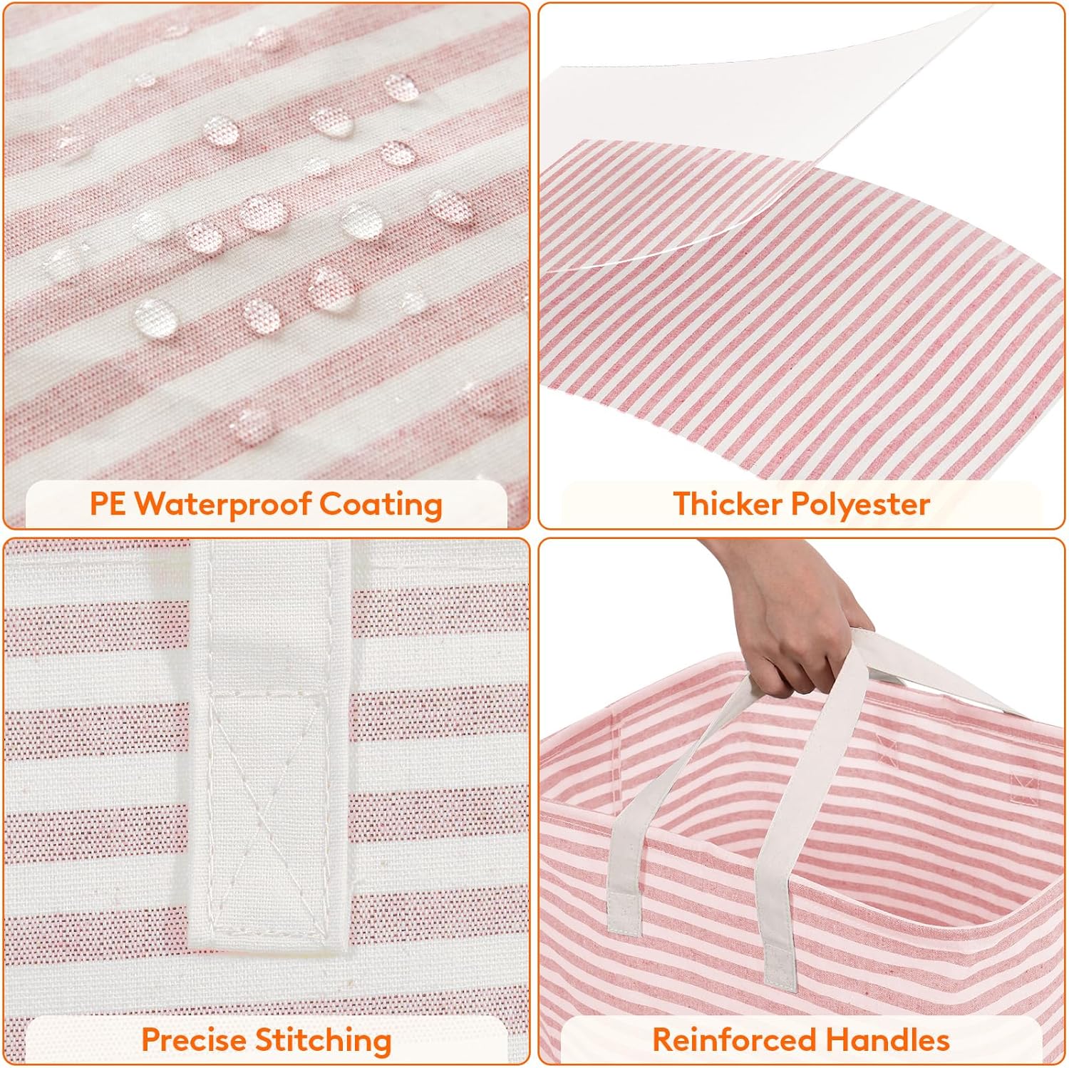 - Premium Material: The foldable clothes basket is made from thick polyester and primuin cotton. The interior features PE waterproof coating can keep stored items dry. Simply use a wet cloth to wipe off the dirt. Do not clean it in washing machine and dryer, as doing so may damage the leakproof PE coating.