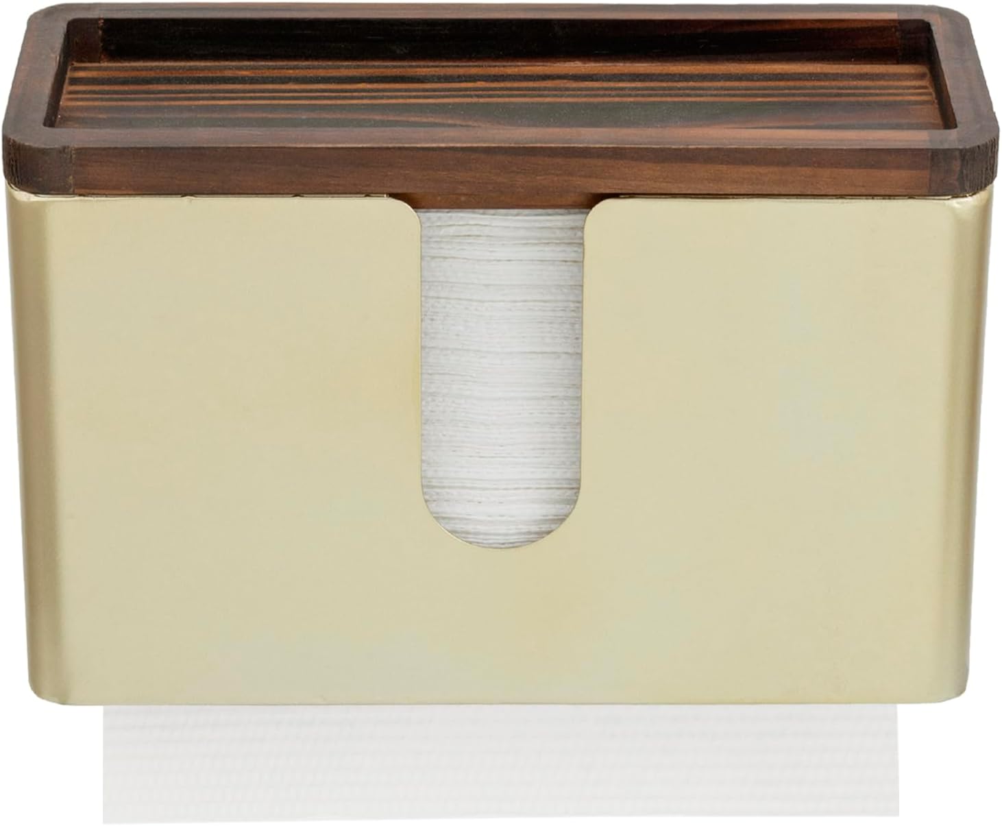 MyGift Deluxe Modern Brass Tone Metal Folded Commercial Paper Towel Holder with Burnt Solid Wood Tray Lid, Wall Mounted Trifold Multifold Z Fold Disposable Napkin Dispenser