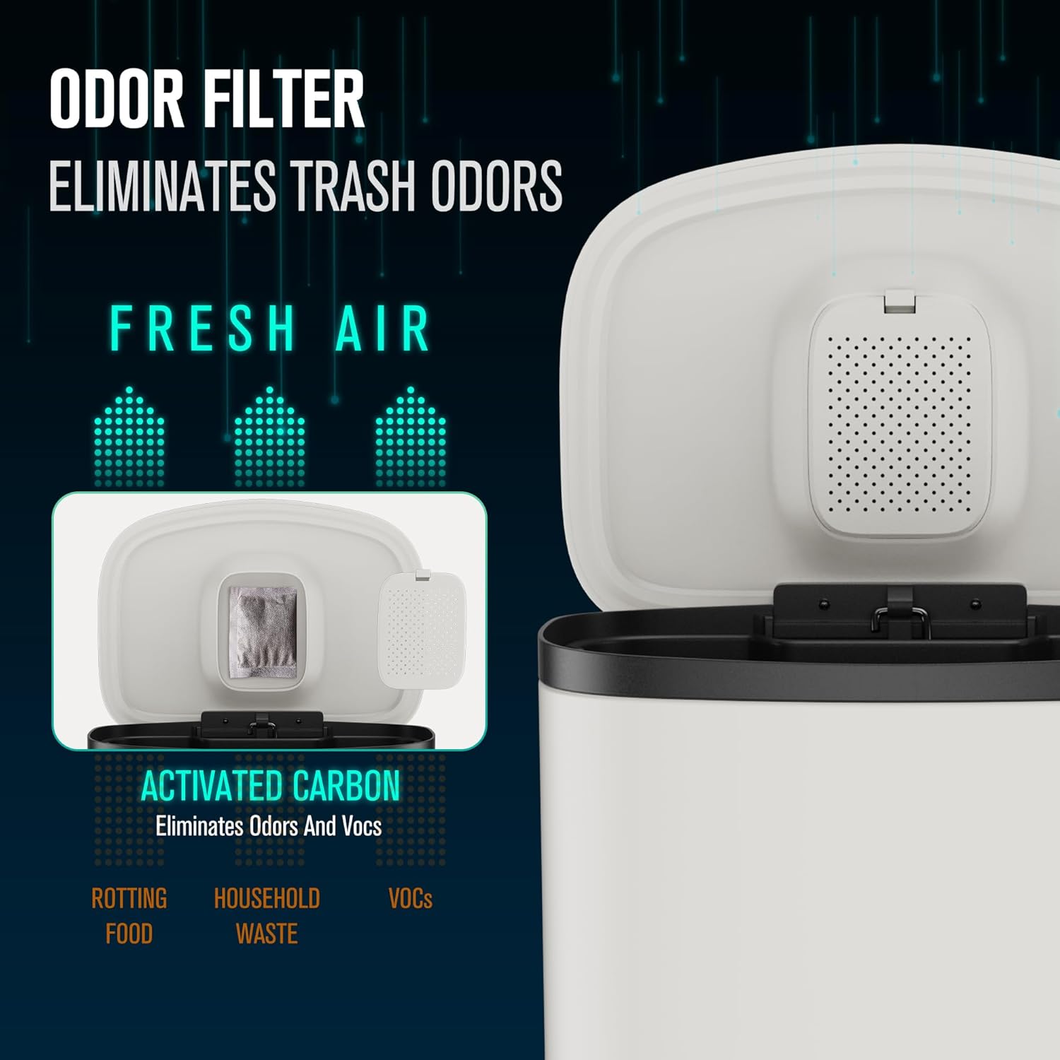 - Odor Control and Convenience: The curved surface top lid not only enhances the modern aesthetic but also conceals a convenient storage space for deodorizing products, keeping unpleasant odors at bay. Plus, we include 30 garbage bags for added convenience, saving you time and hassle.