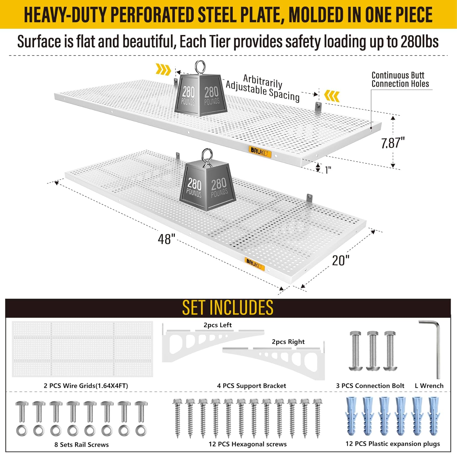 - KIT INCLUDES: Includes 2pcs of face plate; 4 Brackets; 12 Hexagonal screws (Hardened ∅0.2" L/2"); 12 plastic expansion plugs, 8 Sets of rail attachment bolts; 1 L-wrench; 1 installation manual. All the hardware of Brukid professional series wall mounted shelves are under strict quality control and testing, we strive to provide our customers with a quality shopping experience, when you receive the product encountered any problems, please contact us at the first time, we will certainly give you a satisfactory solution