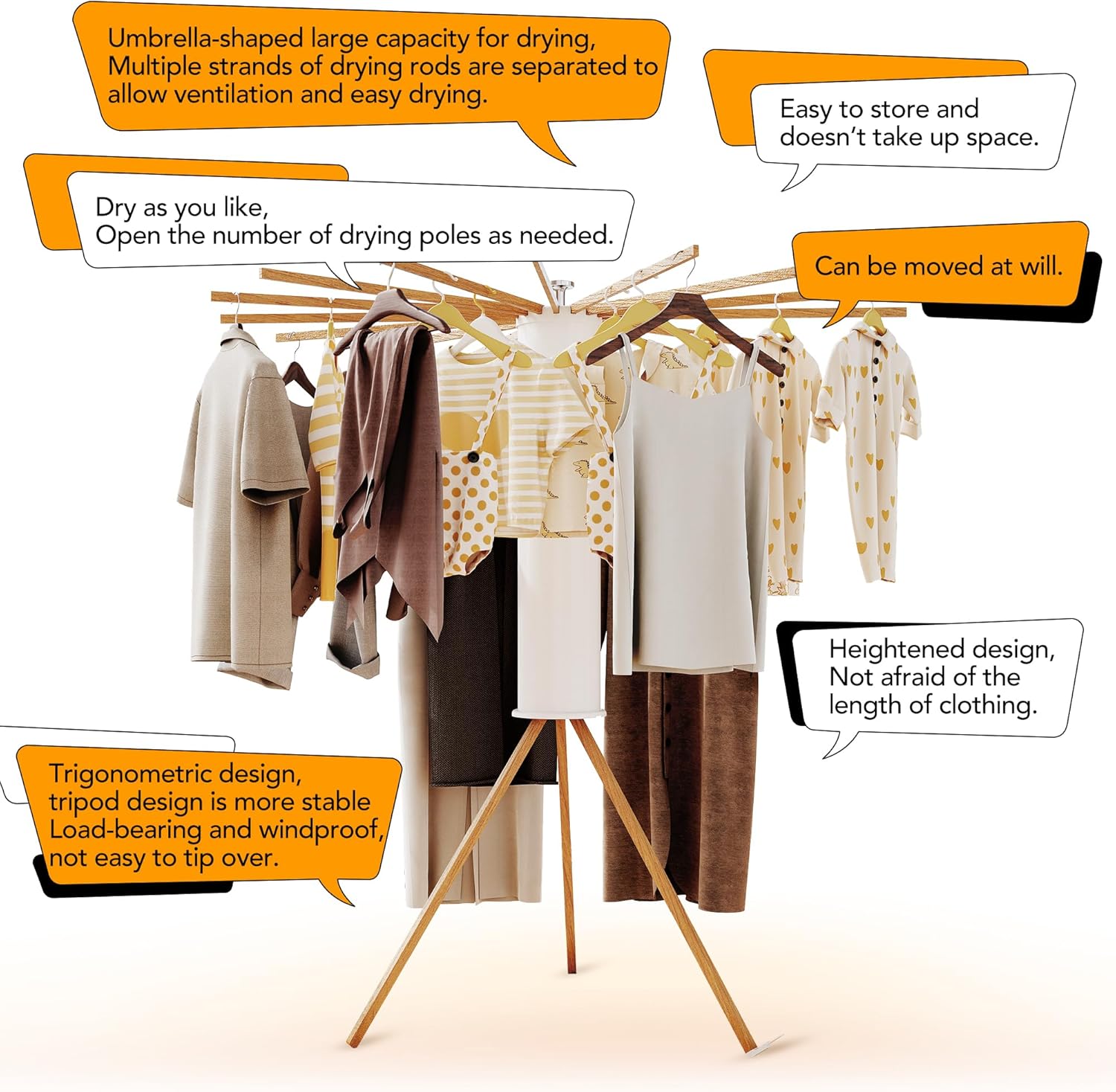 Clothes Drying Rack Tripod,Drying Rack Clothing,Laundry Drying Rack,Floor Standing,16 Wooden Poles,Collapsible Drying Racks for Laundry,Retractable,Foldable,Folding