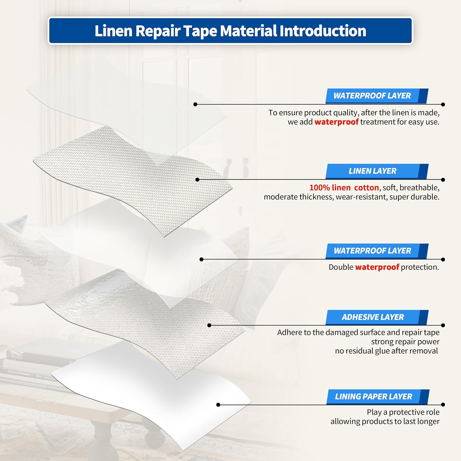 - Easy Application: Clean the damaged area, cut to the appropriate size, peel off the backing paper, and stick it to the damaged area. It only takes a few seconds to complete, and the repair effect is natural and tidy. Suitable for repairing linen products such as sofas, curtains, cushions, furniture, interior decorative fabrics, etc.