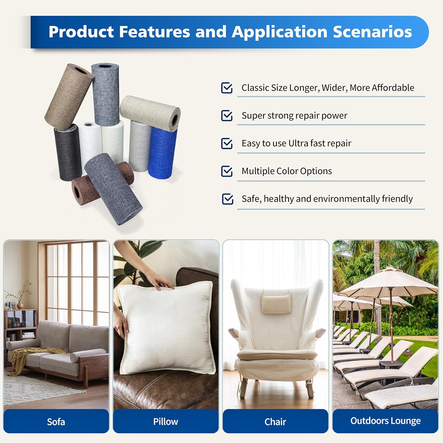 - Easy Application: Clean the damaged area, cut to the appropriate size, peel off the backing paper, and stick it to the damaged area. It only takes a few seconds to complete, and the repair effect is natural and tidy. Suitable for repairing linen products such as sofas, curtains, cushions, furniture, interior decorative fabrics, etc.