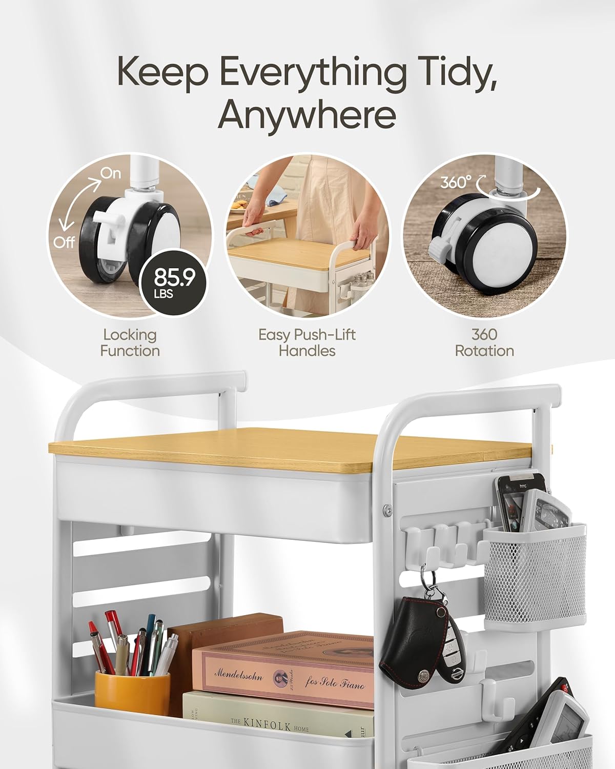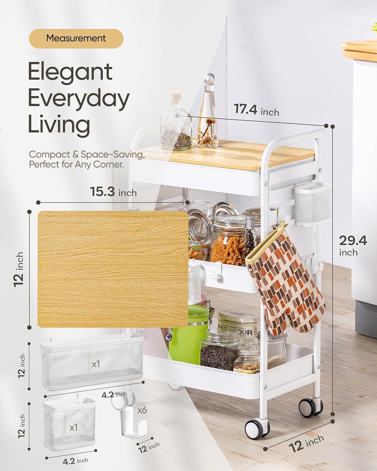 - 🎁【Bonus Accessories for Maximum Convenience】 Enjoy $20 worth of bonus accessories! This cart includes 6 heavy-duty hooks, perfect for hanging kitchen utensils, office supplies, or craft tools. Plus, 2 spacious mesh baskets allow for quick & easy access, ensuring everything stays within reach.