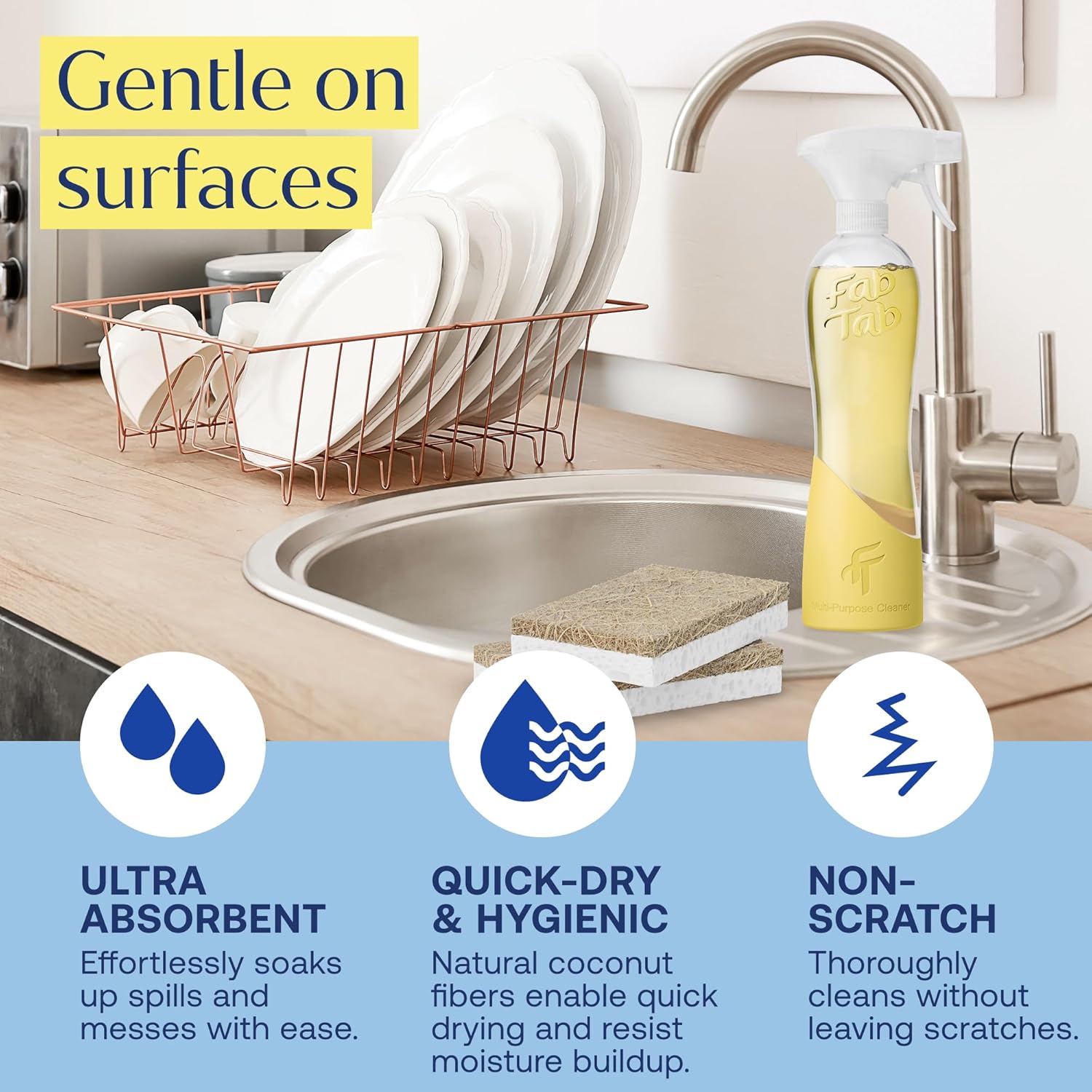 FabTab Coconut and Cellulose Sponges, Plant-Based, Non-Scratch Cleaning Sponges for Dishes, Sinks, Stoves, Countertops, Odorless Kitchen Sponge, Reusable, Dishwasher Safe 6-Count