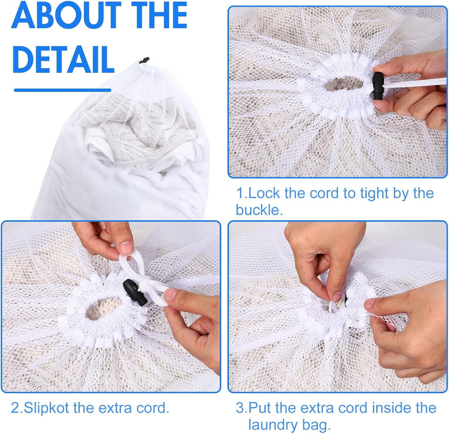 - Drawstring Locking Closure: the mesh bag has a locking buckle and drawstring buckle to prevent overflow; If you are using them as a laundry bag, tuck the buttons inside the bag to prevent the drawstring from loosening in the washing machine