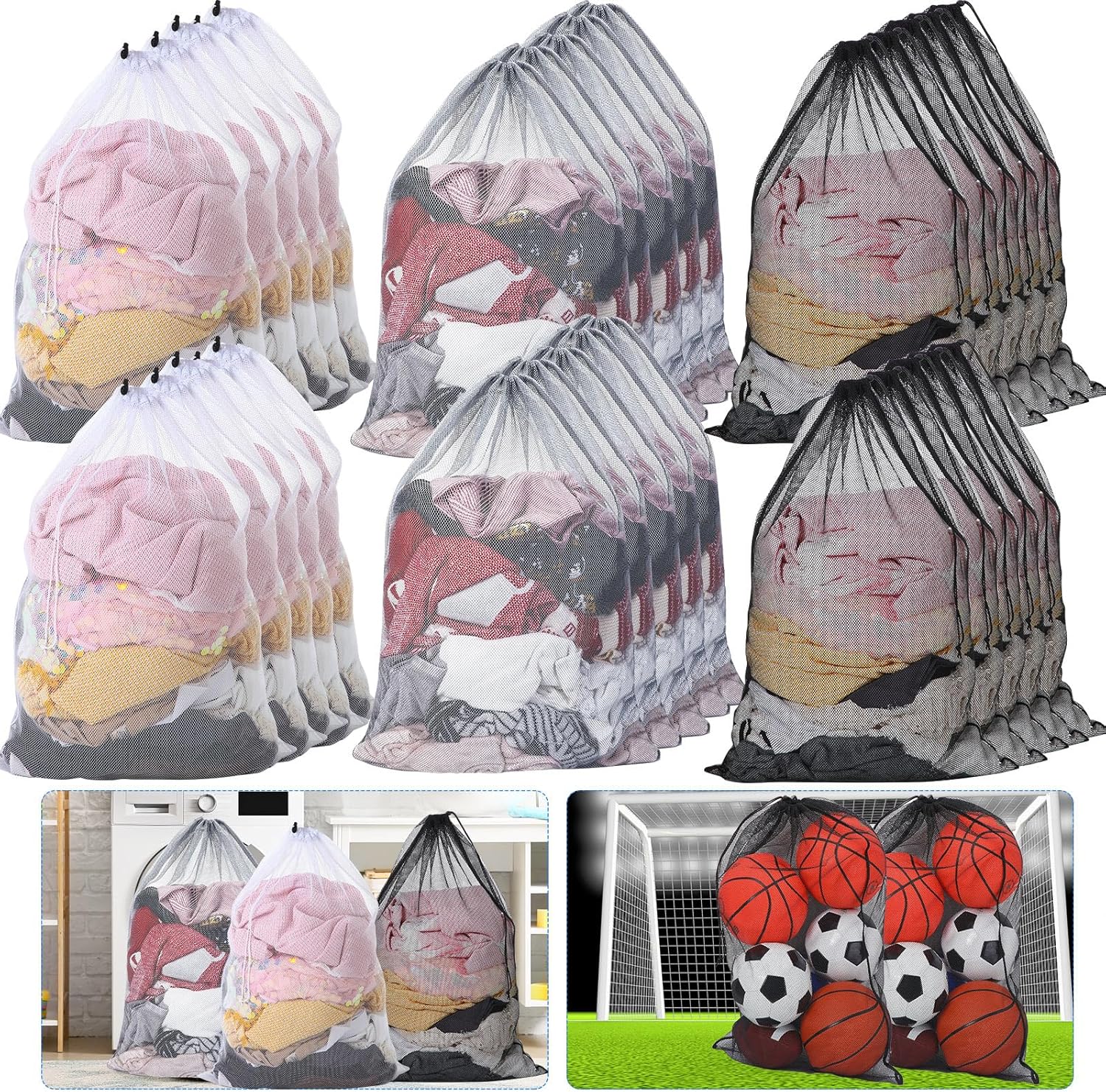Berlune 30 Pack 24 x 36 Inches Large Mesh Bags for Laundry, Wash bags, Sturdy Mesh Material Closed with Drawstring, Factory, University, Dormitory, Travel and Apartment Dweller (White, Black, Gray)