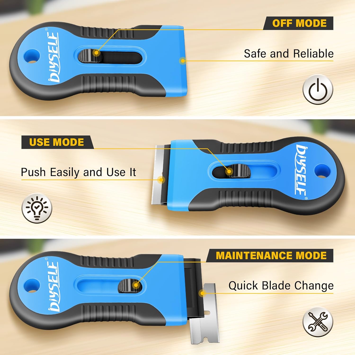 - High-Quality Blades and Professional Structural Design: This razor blade scraper features high-quality carbon steel blades and a three-stage adjustment mechanism. The initial position securely locks the blade inside for safety. Pushing the button forward extends the blade for use, while further advancing it exposes the blade holder for quick replacement. This razor scraper is designed for professional tasks and includes 10 replacement blades to ensure a plentiful supply.