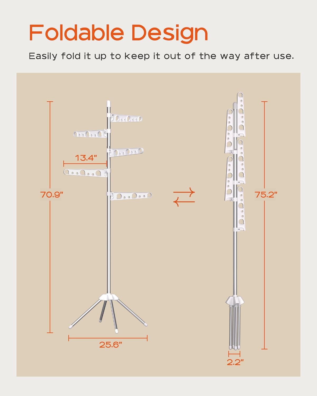 - [Foldable and Space-Saving] This vertical drying rack measures 25.6”D x 25.6”W x 70.9”H and takes up very little space. After use, simply fold the four legs and three drying rods into a smaller size: 2.2 "D x 2.2 "W x 75.2"H, which can be leaned against the footrest, perfect for apartment laundry rooms or narrow spaces and corners.