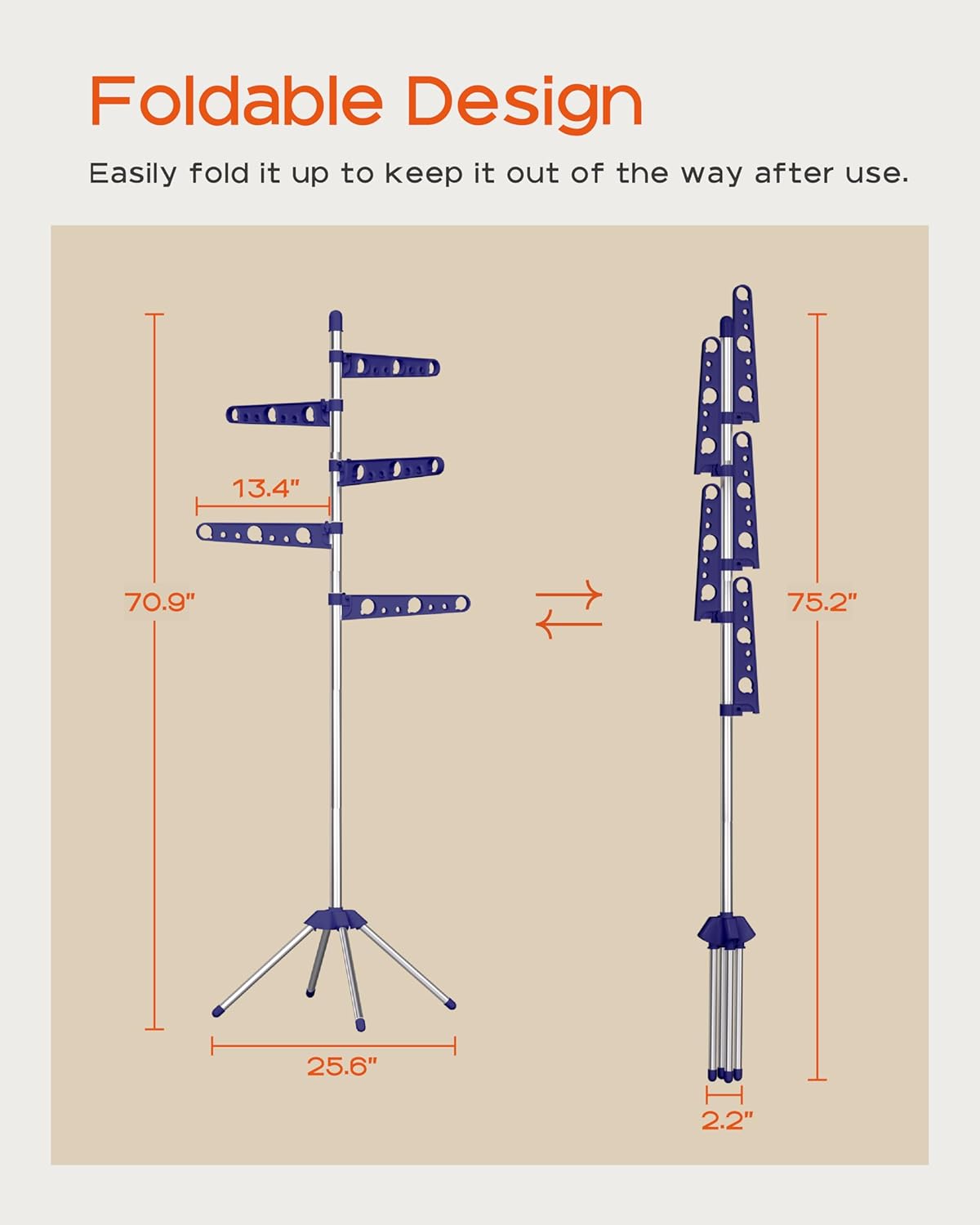 - [Foldable and Space-Saving] This vertical drying rack measures 25.6”D x 25.6”W x 70.9”H and takes up very little space. After use, simply fold the four legs and three drying rods into a smaller size: 2.2 "D x 2.2 "W x 75.2"H, which can be leaned against the footrest, perfect for apartment laundry rooms or narrow spaces and corners.