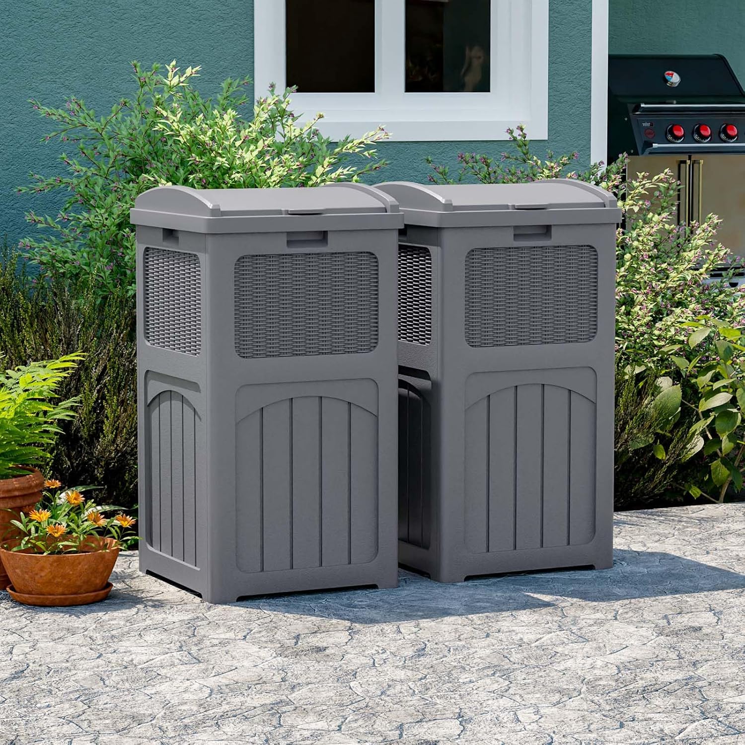 Patiowell 36 Gallon Outdoor Trash Can, Resin Outdoor Garbage Can with Lid for Patio, Backyard, Deck, Gray (2 Pack)