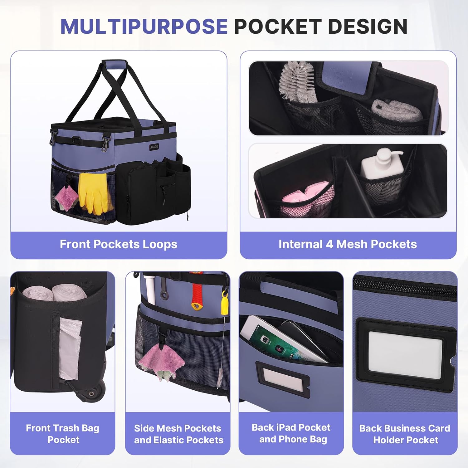Large Rolling Cleaning Caddy Bag with Detachable Trolley, Waterproof Cleaning Caddy on Wheels for Housekeepers, Cleaning Cart Supplies Organizer for Home,Car,Office,Picnic (Denim Blue)(InPatent)