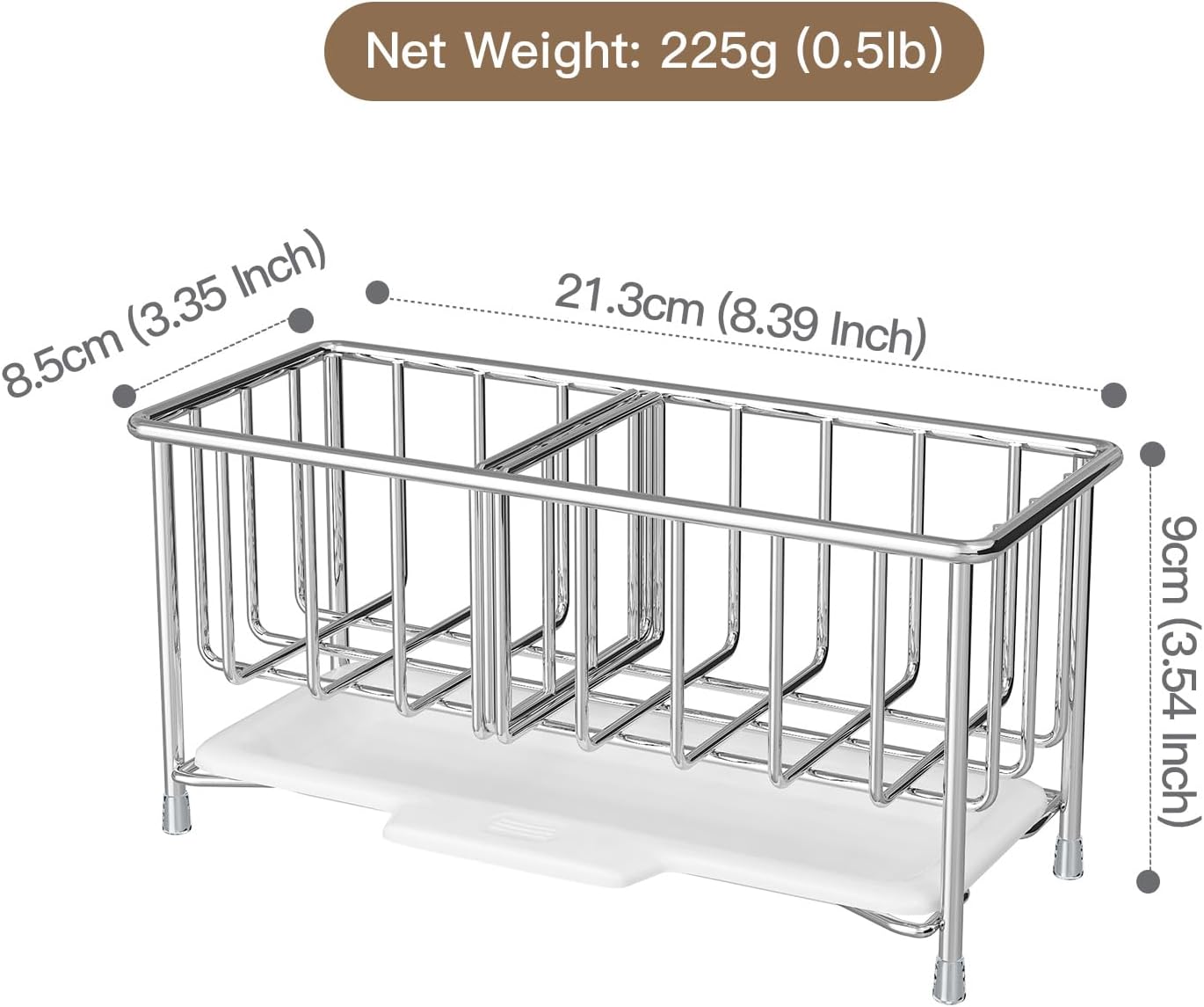 - ăSaving SpaceăThe stainless steel sponge organizer can help you better categorize your products, say goodbye to the messy sink counter, keep your desktop simple and beautiful. The size of this organizer is 8.39x3.35x3.54 Inch, this large storage rack is designed to hold more items, such as kitchen sponges, brushes, hand sanitizers, detergents and bottles, etc., which saves you more space