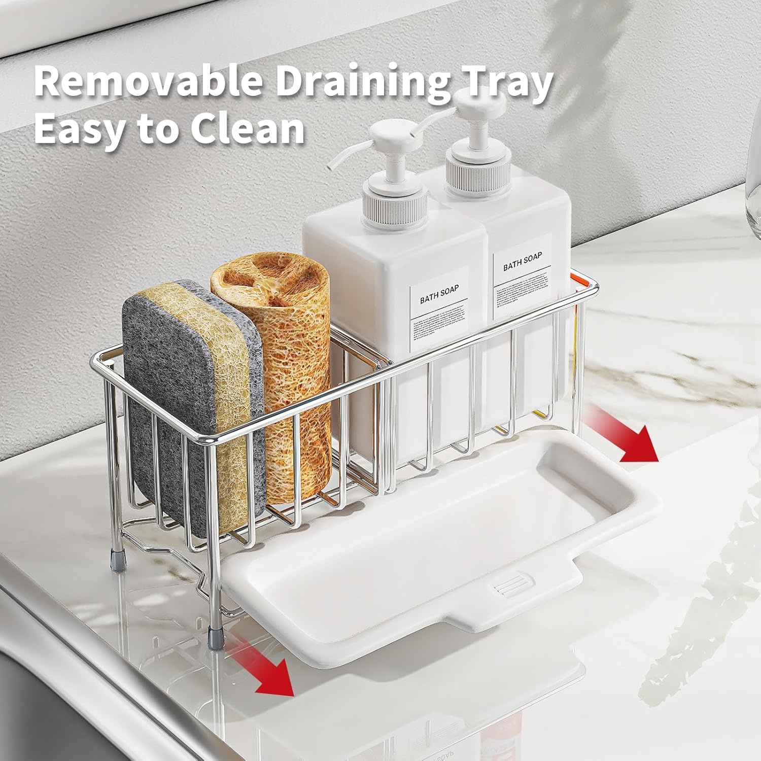 - ăDry and Ventilatedă This kitchen sink sponge holder features a split-sink design with a removable tray, which can effectively drain the moisture from kitchen cleaning tools and make them dry faster. The discharged moisture falls on the tray for easy pouring and cleaning, which can always keep the desktop clean and tidy, and keep it dry and ventilated