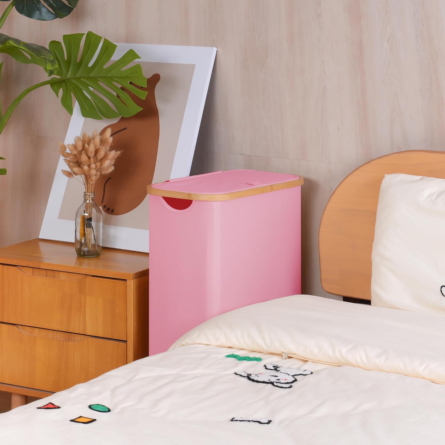60L Slim Laundry Basket with Wheels,Narrow Hampers for Laundry,Freestanding Laundry Hamper with Lid&Bamboo Handles,Collapsible & Waterproof Tall Cloth Hamper for Dorm Family(Pink)