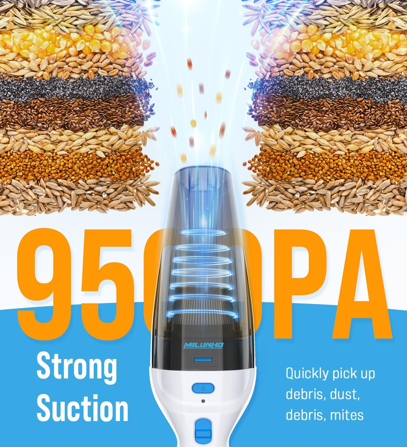- ăNEWLY UPGRADED 9500PA STRONG SUCTION POWERă: The upgraded handheld vacuum cleaner provides up to 9500Pa strong cyclonic suction power, which is twice as strong as the average car vacuum cleaner. Car Vacuum idea for cleaning dust, crumbs and pet hair in cars, sofas, walls, stairs and other hard-to-reach places.