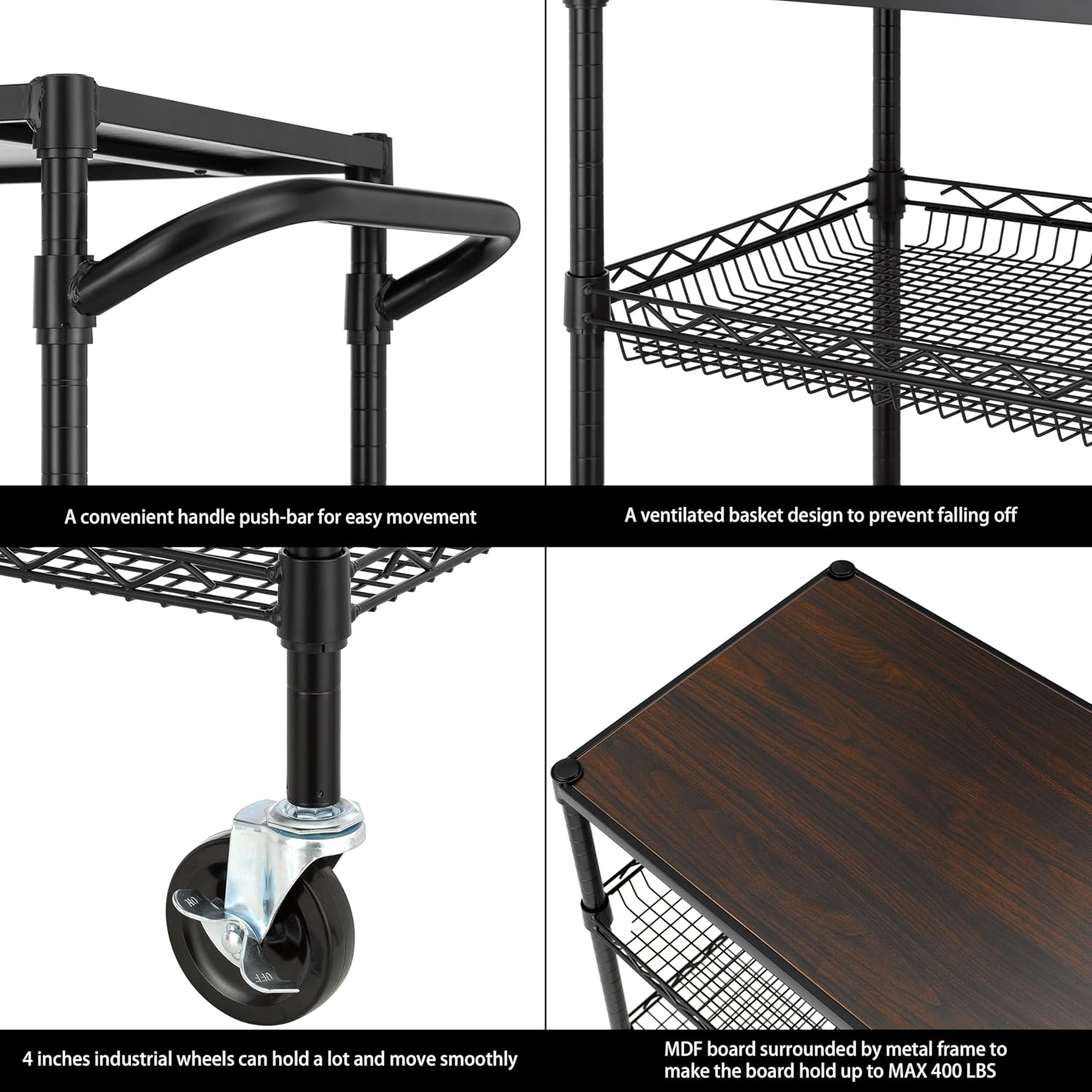 - UPDATE and OPTIMIZE - Wood top carts have more functions with more classic appearance are widely used in daily family life, but load-bearing capacity of the wood top has always been a problem, so we develop a new cart which is used steel frame to reinforced the wooden board and can make the top board loading capacity MAX to 400LBS, balancing aesthetics and load-bearing capacity.