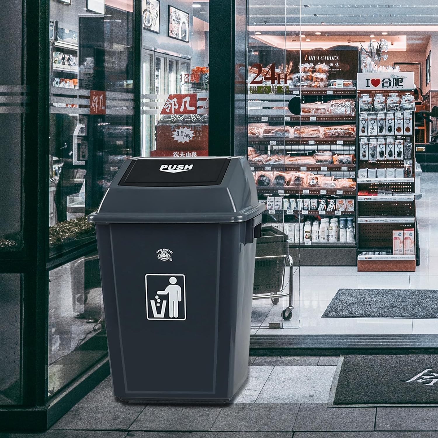 - The shake cover design allows for one hand operation, saving time and effort. The detachable cover can secure the garbage bag to prevent it from falling off