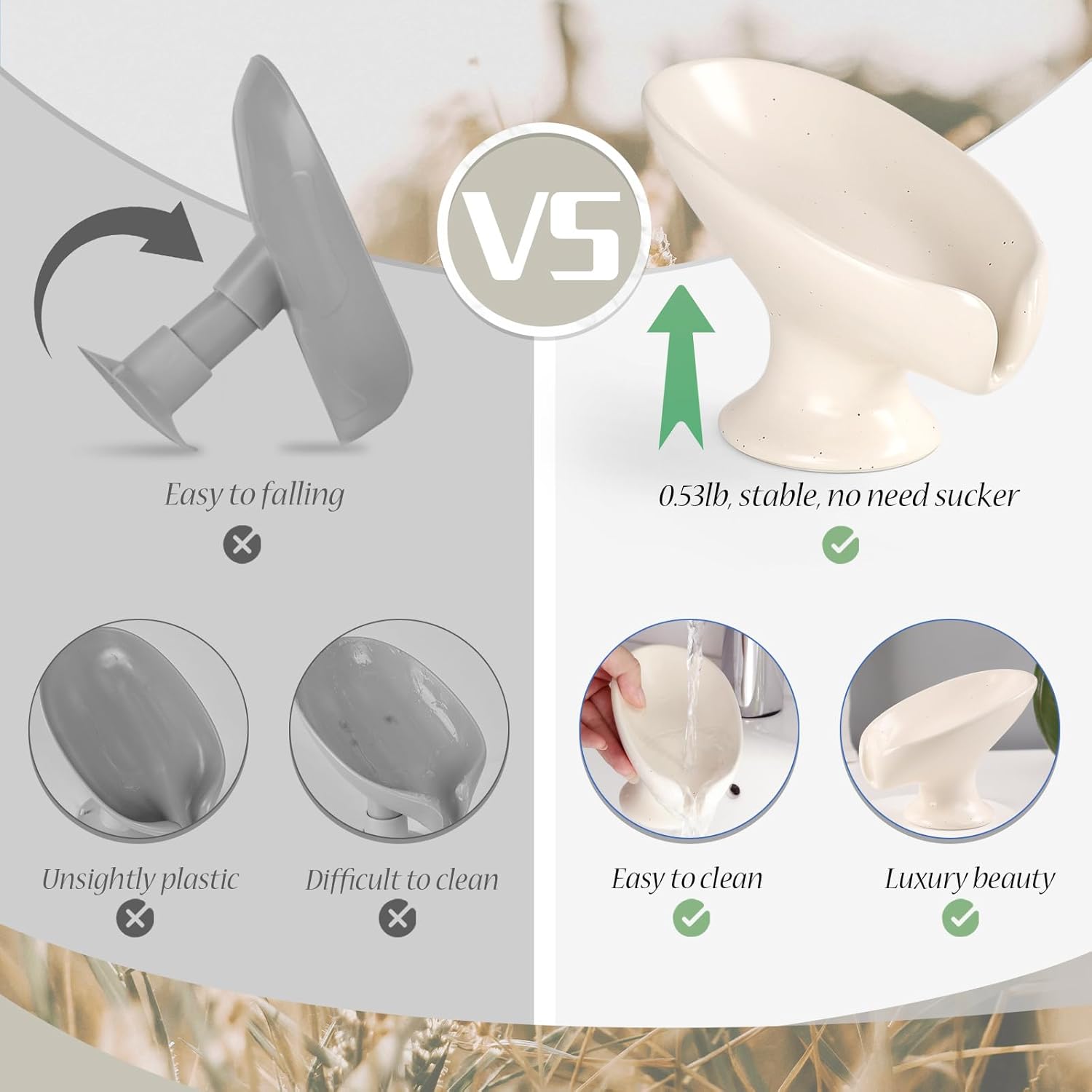 - Self-Draining Design: This ceramic soap dish features a 45° angled design inspired by lotus leaves; promotes quick drainage to keep your bar soap dry and reduce waste; the soap holder stays stable by its own weight, no need for suction cups