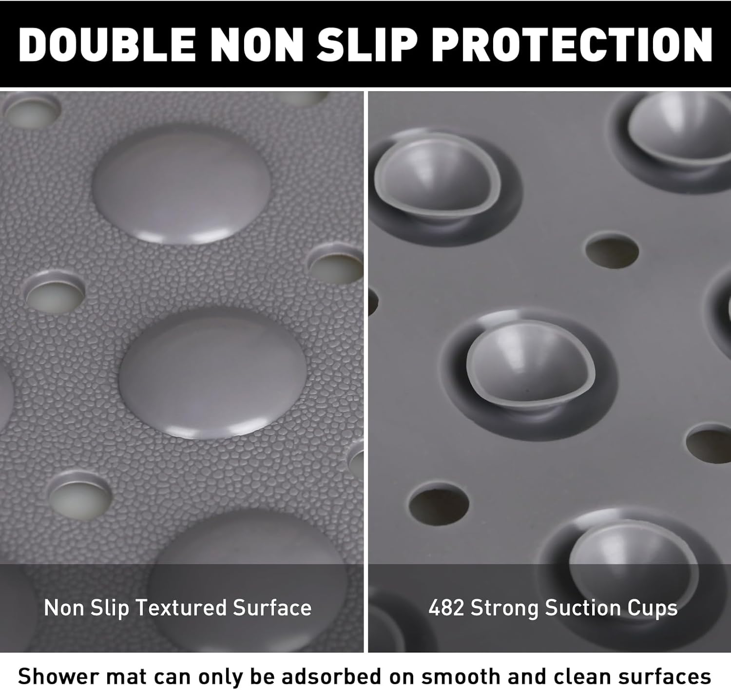 - SUPER NON SLIP: Our shower mat has a delicate anti-slip texture on the surface and 482 suction cups on the back, which can be firmly adsorbed on the floor. Note: To prevent slipping, do not use shower oils. Shower mats can only be adsorbed on smooth and clean surfaces