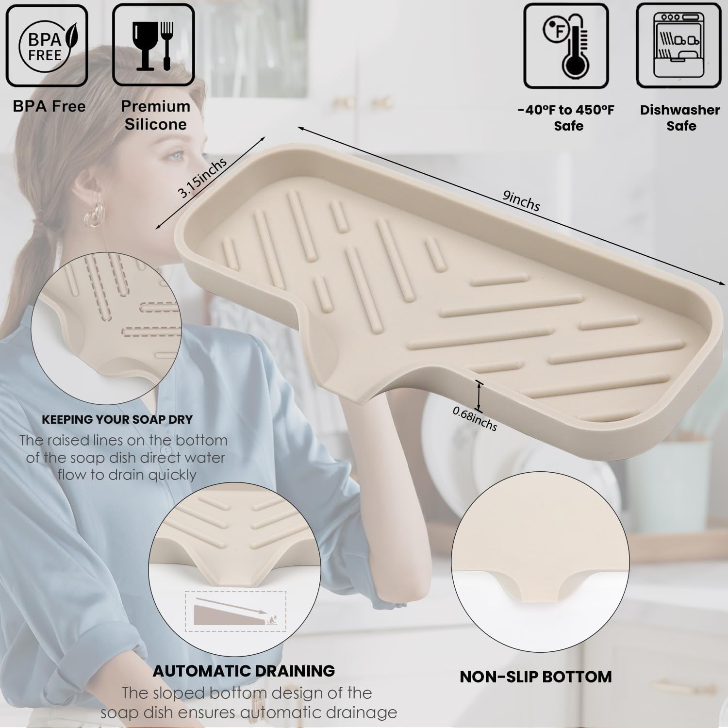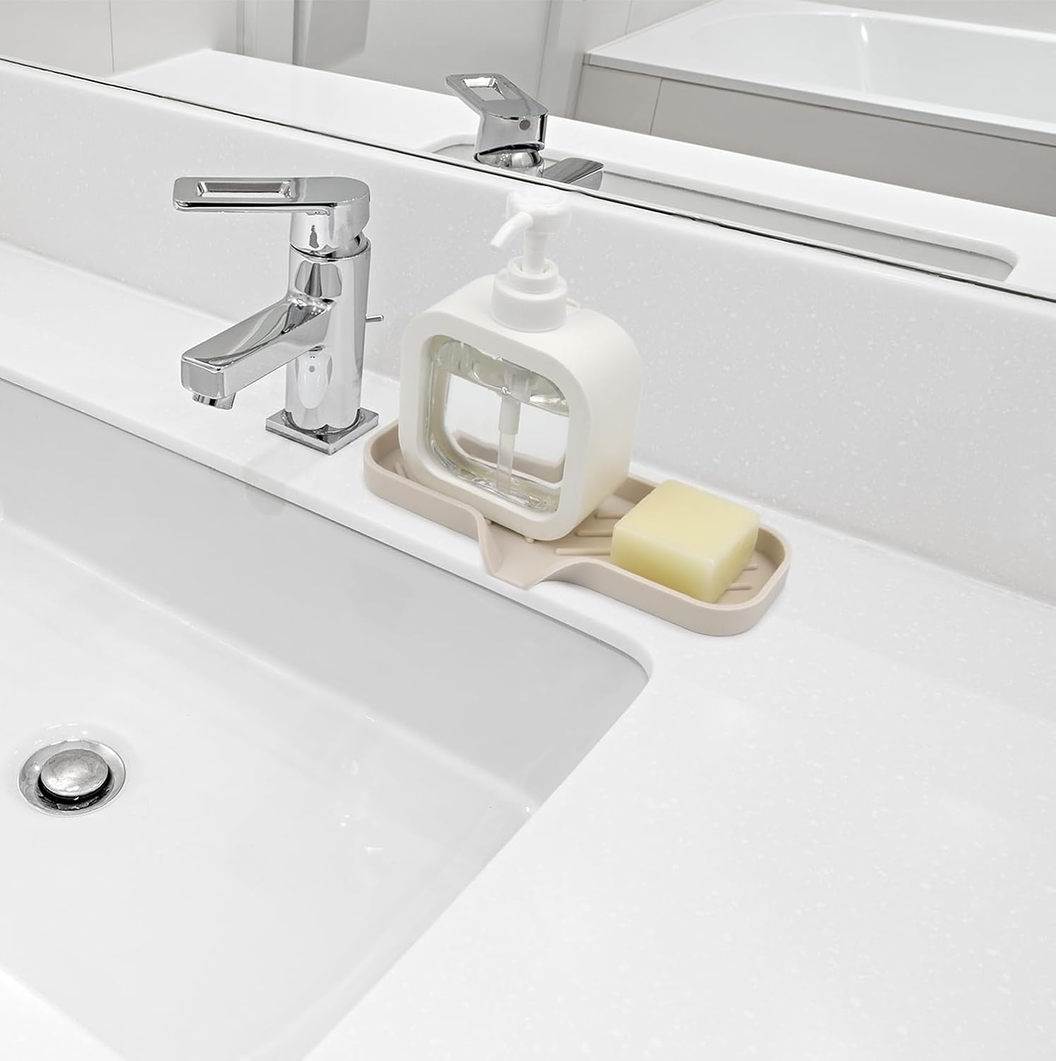 YASMEN Silicone Bathroom Soap Dishes, Sink Sponge Holder for Kitchen, Rubber Soap Dish with Drain, Shower Soap Sponge Tray, Sink or Counter Organizer, for Bar Soap, Bottle, Dish Soap Dispenser-Tapioca