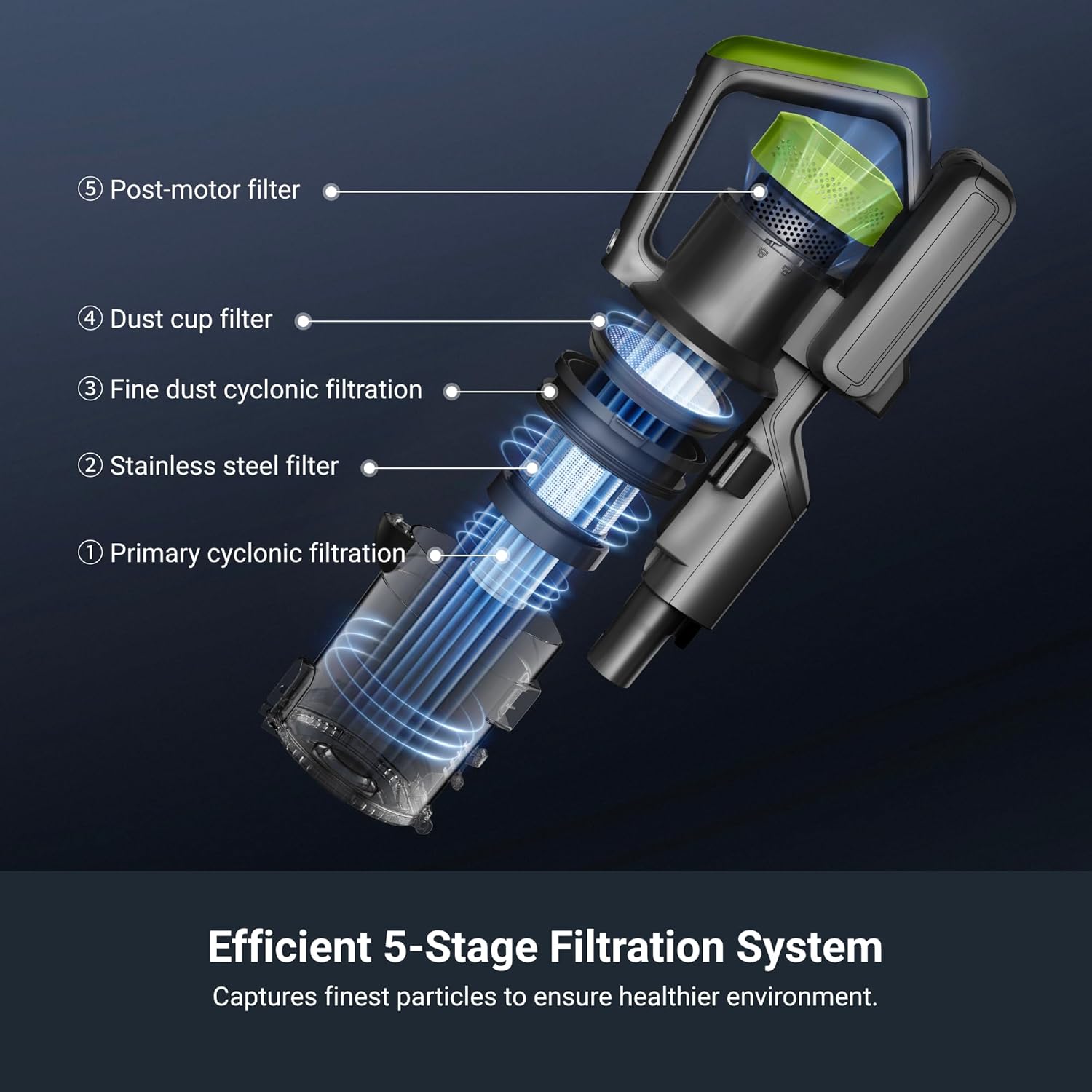 - 5-Stage Filtration System: A 5-layer filtration system on cordless vacuum cleaner captures fine dust and small particles anywhere, so dust is kept out of air, preventing secondary pollution.