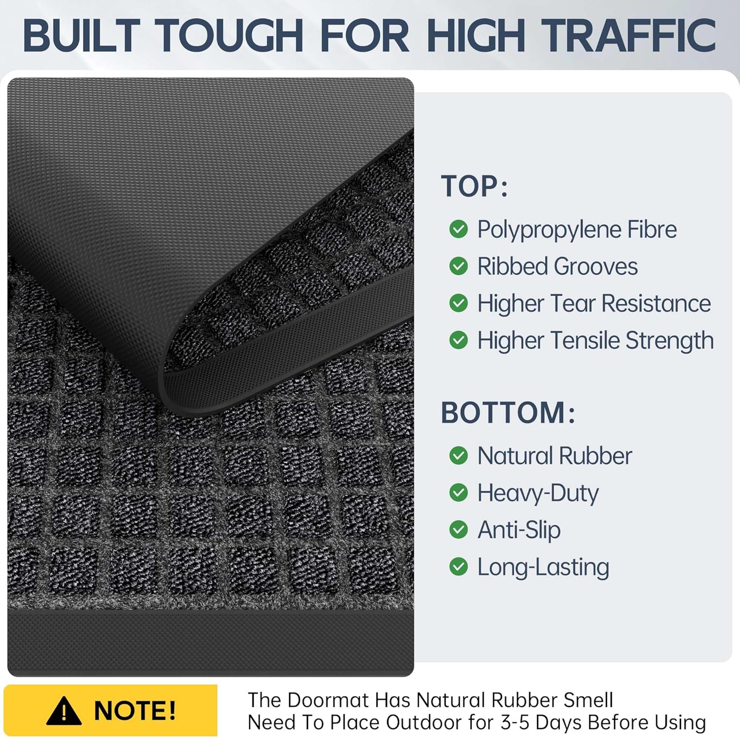 - Built Tough For High Traffic: Amyracel durable outside door mat is made of polypropylene, with strong anti-ultraviolet function, placed outdoors, under the hot sun, will not cause damage, anti-aging, with a long service life. The entrance mat backing is made of natural rubber to prevent the floor doormat from sliding during use. Rugged and durable material allows the doormat to accept a high volume of foot traffic