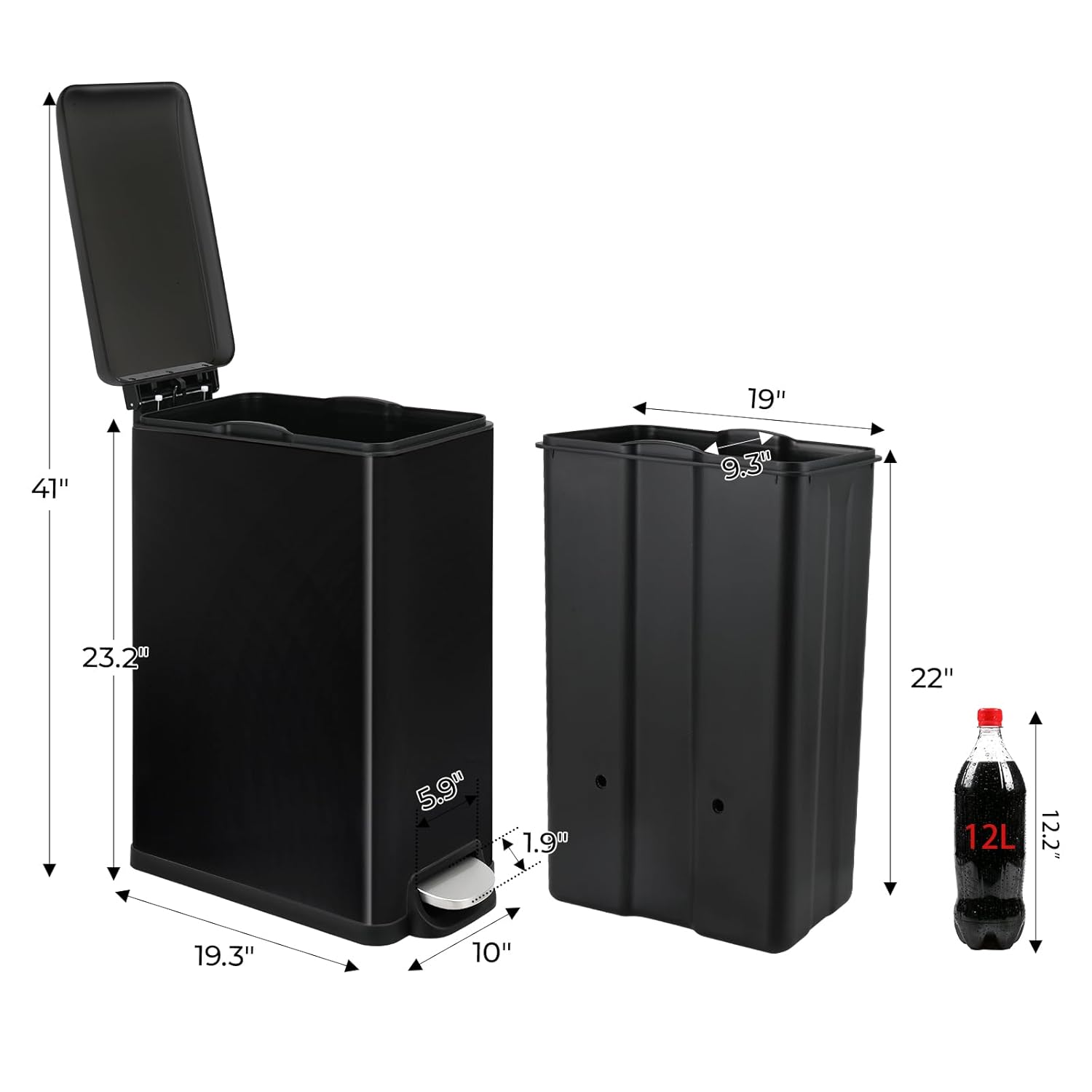 - 【Large Capacity Trash Can】Kitchen trash can measures 23.2" H x 19.3" L x 10" W and has a capacity of 13.2 gallons/50 liters, enough for your daily life. The rectangular trash can obtains the maximum capacity with the smallest space and reduce the number of times you take out your trash!