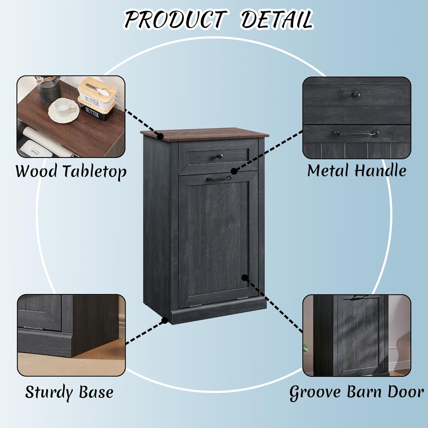 Tilt Out Laundry Hamper Cabinet, 10 Gallon Farmhouse Trash Can Cabinet with Drawer, Hidden Wood Garbage Can Bin Cabinet with Laundry Storage Basket for Bathroom, Kitchen, Dark Grey