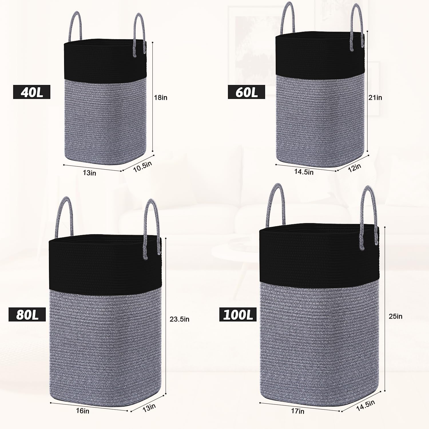 Laundry Basket,Woven Cotton Rope Laundry Hamper,Versatile Storage for Dirty Clothes,Baby Toys,and Blankets in Bathroom, Nursery,and Living Room (Black, 60L)
