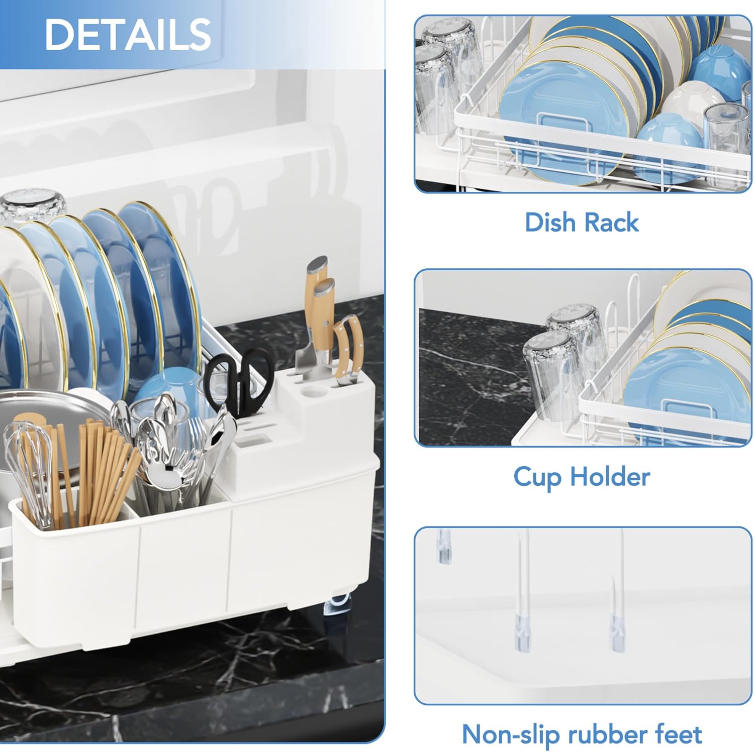 ROTTOGOON Expandable Dish Drying Rack,Multifunctional Adjustable Dish Drainer with Swivel Spout and Anti-Rust Dish Rack with Removable Cutlery & Cup Holders for Kitchen Counter,White