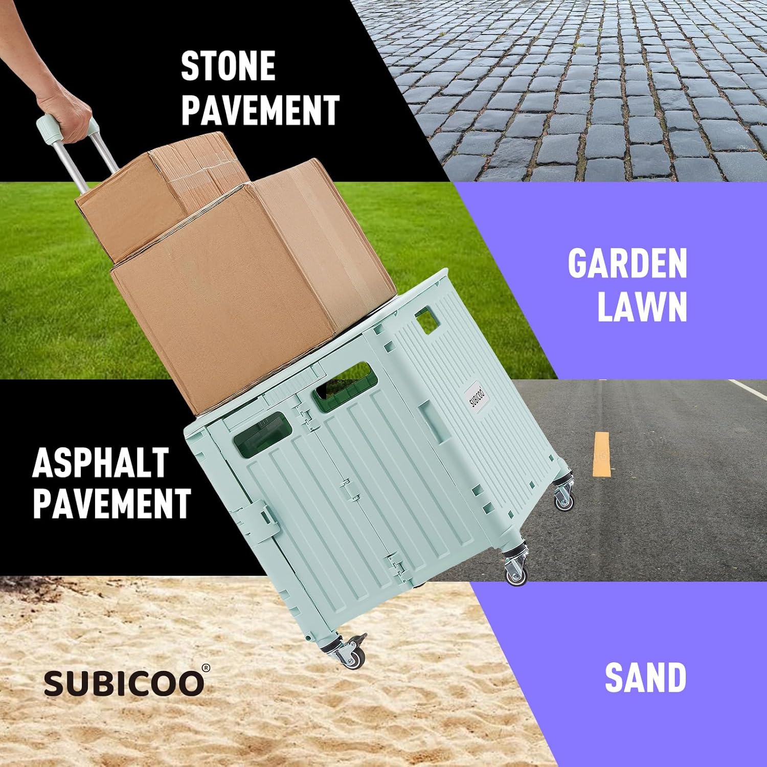 Folding Utility Cart Portable Rolling Crate Handcart Shopping Trolley Collapsible Tool Box, with Lid, on 4 Rotate Wheels, for Grocery, Shopping, Office, Camp, Teacher (Green)