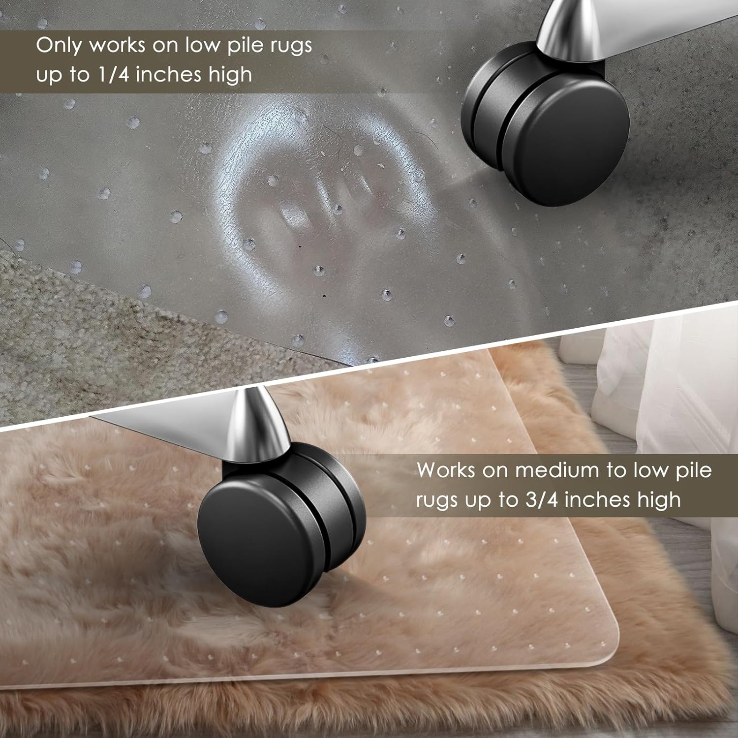 - 【Move Chairs Easily on the Carpet】The office chair mat for carpet is designed to allow people to move their chairs easily even on carpet, reducing back pressure, while protecting your carpet from damage. The unique light texture of the surface allows you to slide on the floor mat very simply to enhance your office experience, with spikes type dots on the back to securely fasten to most carpets.