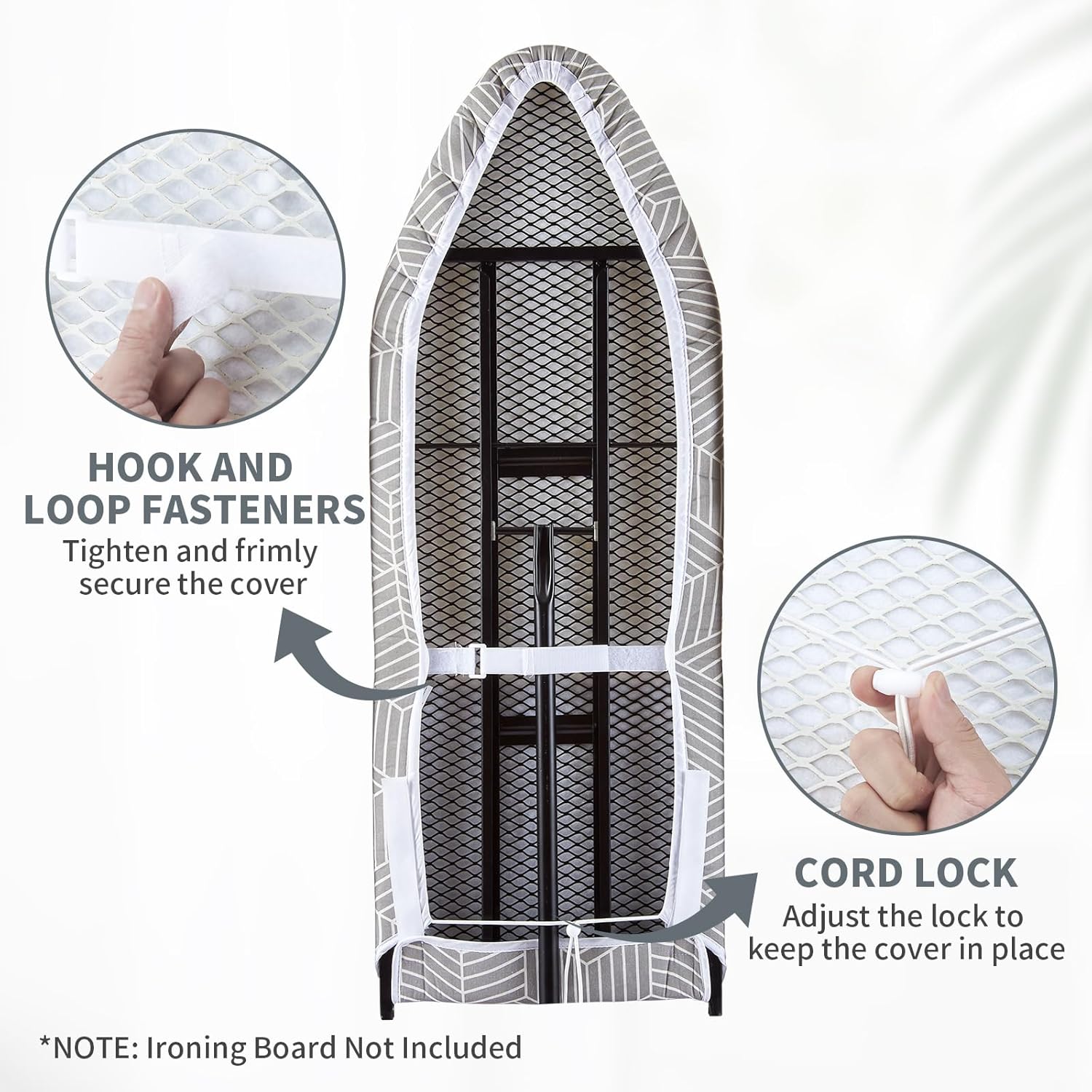 - HOOK AND LOOP FASTENERS AND ADJUSTABLE CORD: Come with two straps, you can pull the cover surface tight and straight with tension straps for universal fit. The drawstring on the side can firmly fix the ironing cover so that it is tightly attached to the ironing board