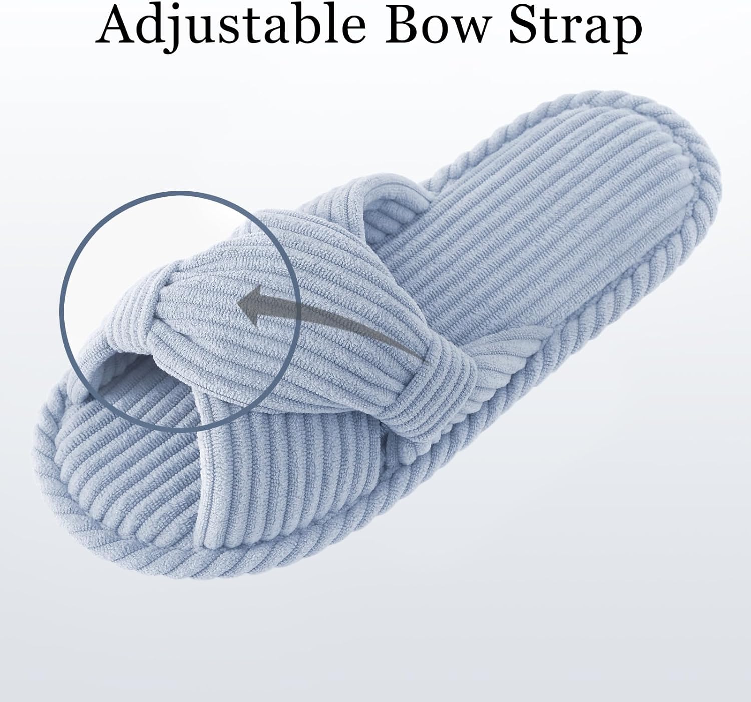 - Breathable Bow Slippers: Crafted from luxurious corduroy fabric, our stylish cross-band slippers are cute and functional, they are tied in in a unique and classic bow design, elegantly wrap around your feet while ensuring optimal ventilation to prevent sweating.