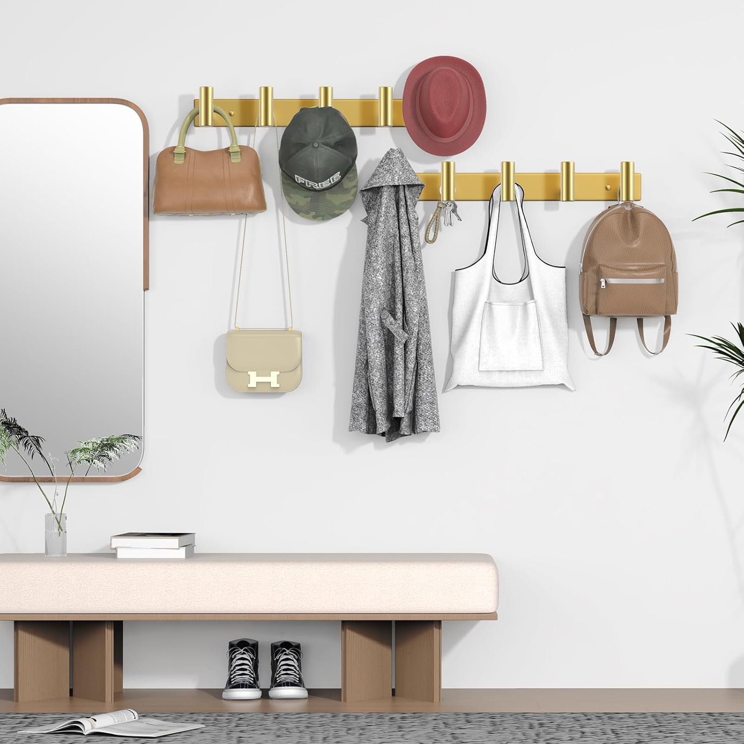 - Versatile Use: This Gold Row Hook Coat Rack for various locations, including bathrooms, kitchens, living rooms, entrances, and offices. Use it to hang towels, kitchenware, coats, hats, jackets, wallets, keys, and more, adding functionality and organization to your space.