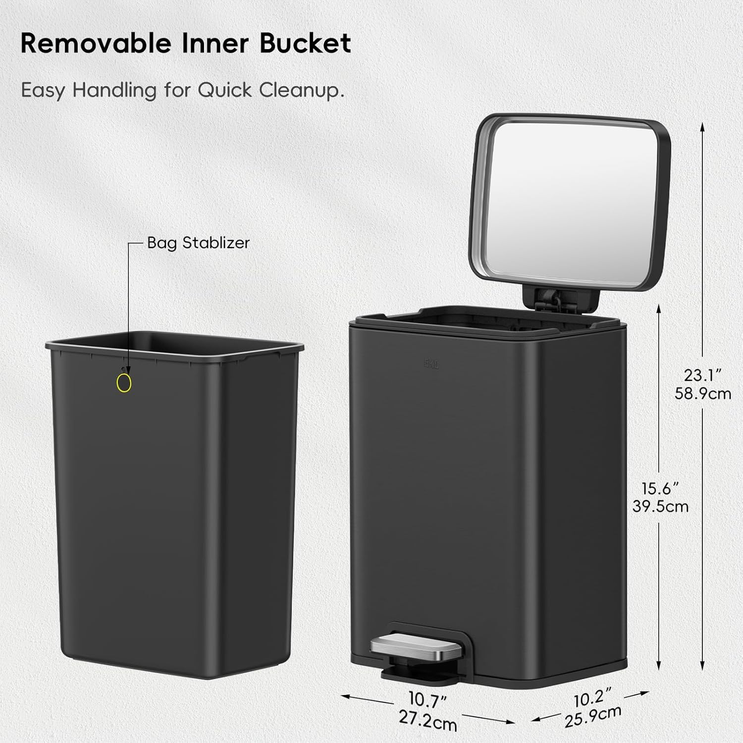 - SPACE-SAVING ELEGANCE: This EKO bathroom trash bin features a sleek and slender design, perfect for tight spaces. Maximize your room's potential with this chic, space-efficient solution that adds style without sacrificing functionality.