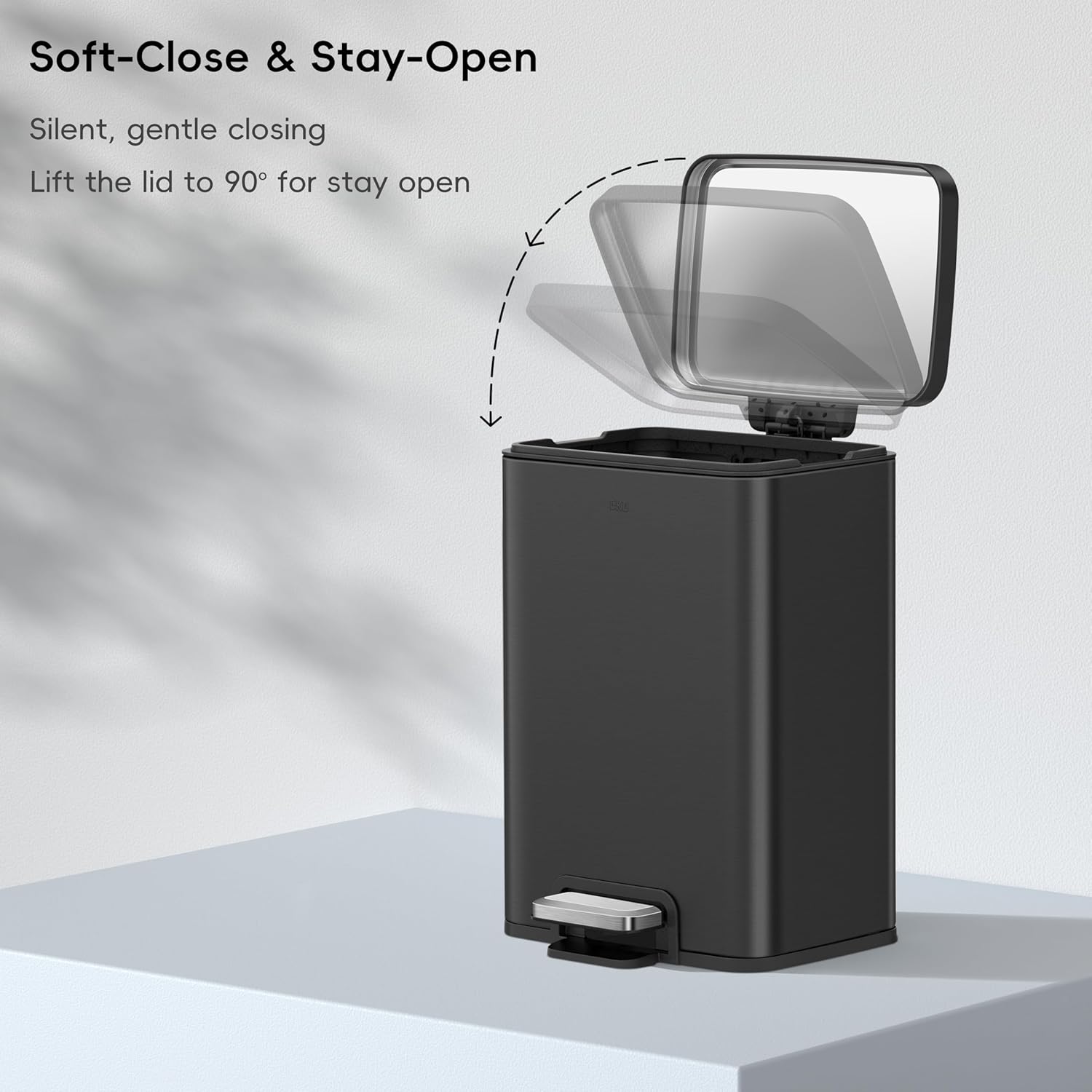 - SOFT CLOSE & STAY-OPEN LID: Enjoy the convenience of a lid that opens and closes smoothly and silently with a simple push of the pedal. The lid can also stay open at a 90° angle as long as you need, making disposal tasks easier.