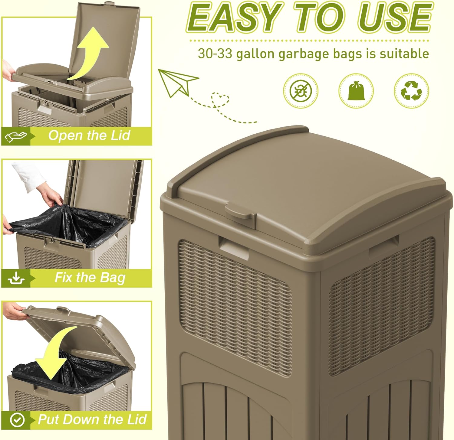 - Large Storage Space: This trash can has a storage capacity of 33 gallons and measures 16.5”(L) x 15.7”(W) x 31.5”(H). It can fit garbage bags in 30-33 gallon.